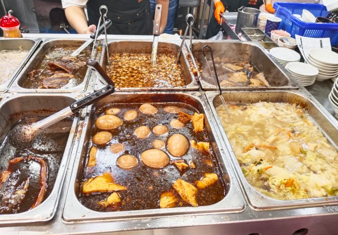 料理區在遮雨棚下方,可以看到白菜滷,滷蛋跟油豆腐等平民美食小吃,在料理區右側的架子,還擺放辣椒醬,芥末跟醬油。