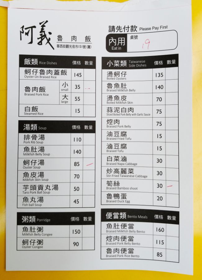 從宮殿式牌樓建築的入口走進夜市,可以看到阿義魯肉飯的木底白字招牌。