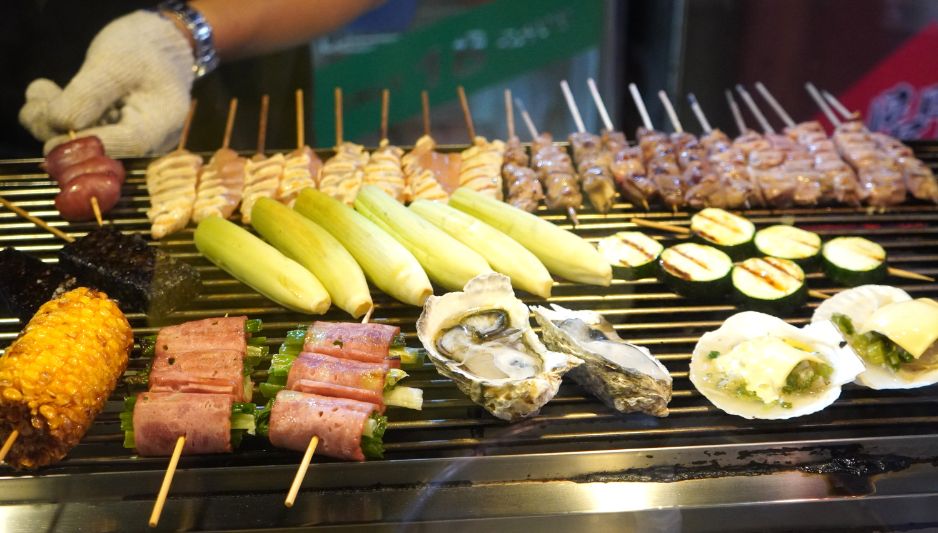 店門口右側立著一個個鐵桶,正在烘烤桶仔雞,在鐵桶後方則是串燒的烤架,架上擺放滿滿的食材。
