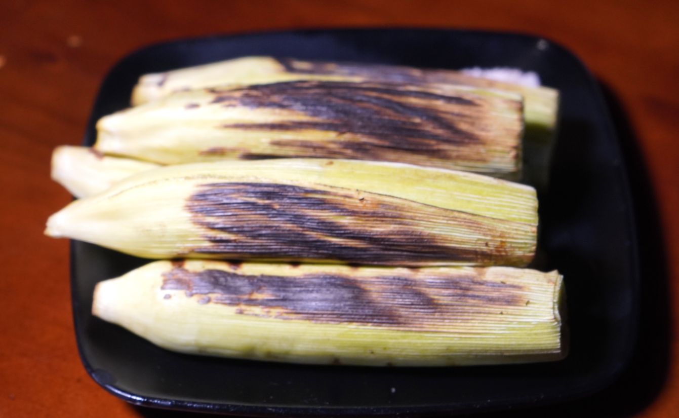 帶皮玉米筍,經過火烤之後,仍維持甜脆的口感,沾一點鹽巴味道更好吃。