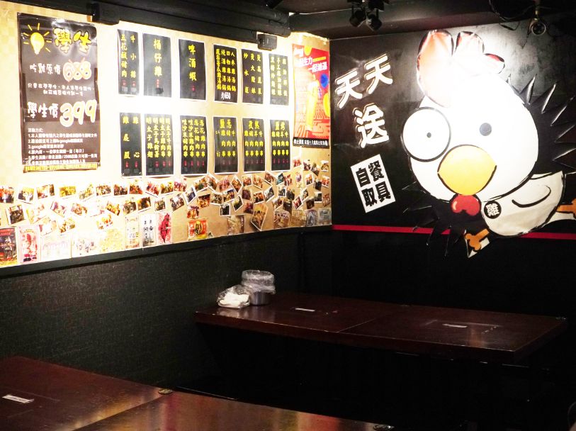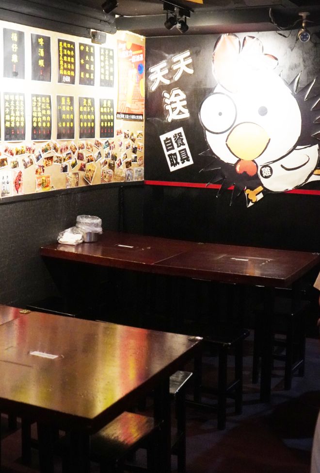 用餐區環境偏暗,帶有居酒屋的氣氛。除了中間多個四人方桌,可以合併,右側還有多個長桌,也可以看到超可愛的雞老闆Logo。