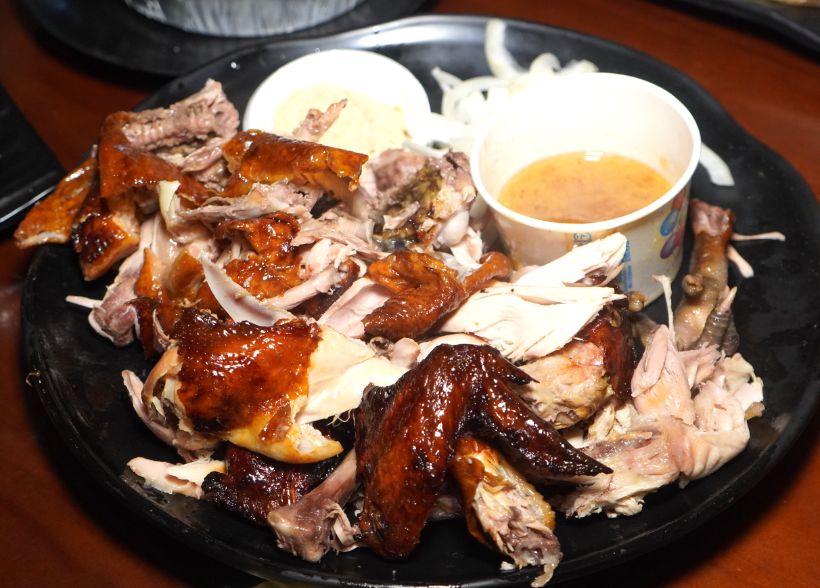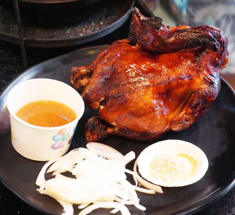 精選2斤半土雞,經過CAS優良認證,並加入多種中藥材24小時進行醃製,再放進鐵桶內烘烤。隨著店員熟練地將桶仔雞取出,色澤金黃亮麗的烤雞,帶著讓人口水流滿地的香氣映入眼前。倒入盤中出,有著滿滿的雞油。