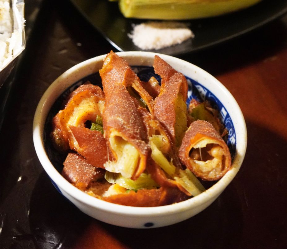 雞皮炸的酥香,吃起來很涮嘴,也是一道很棒的下酒菜。