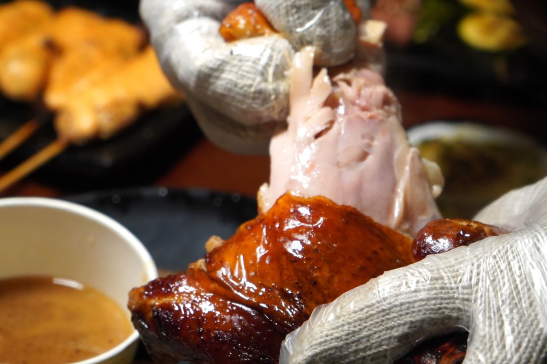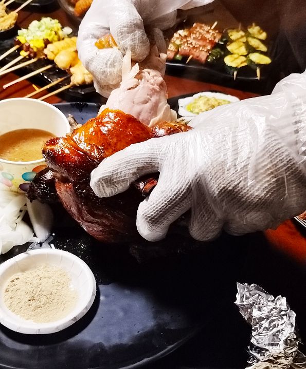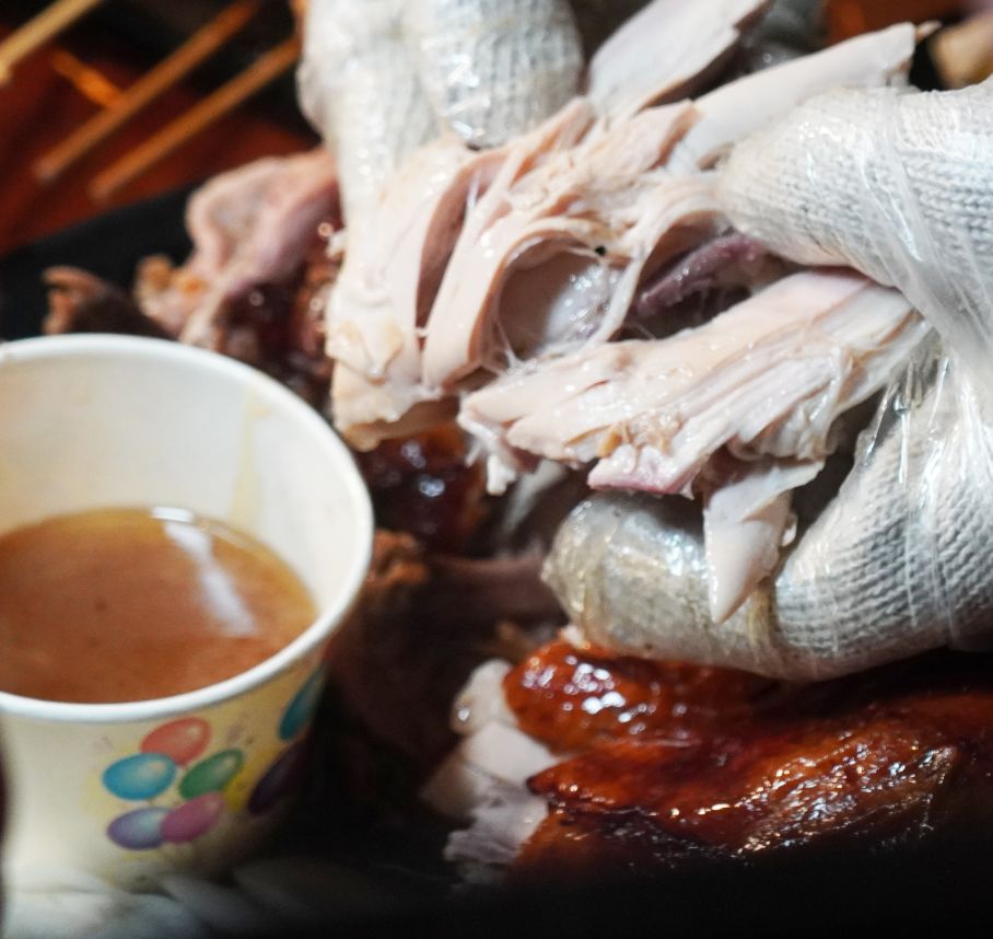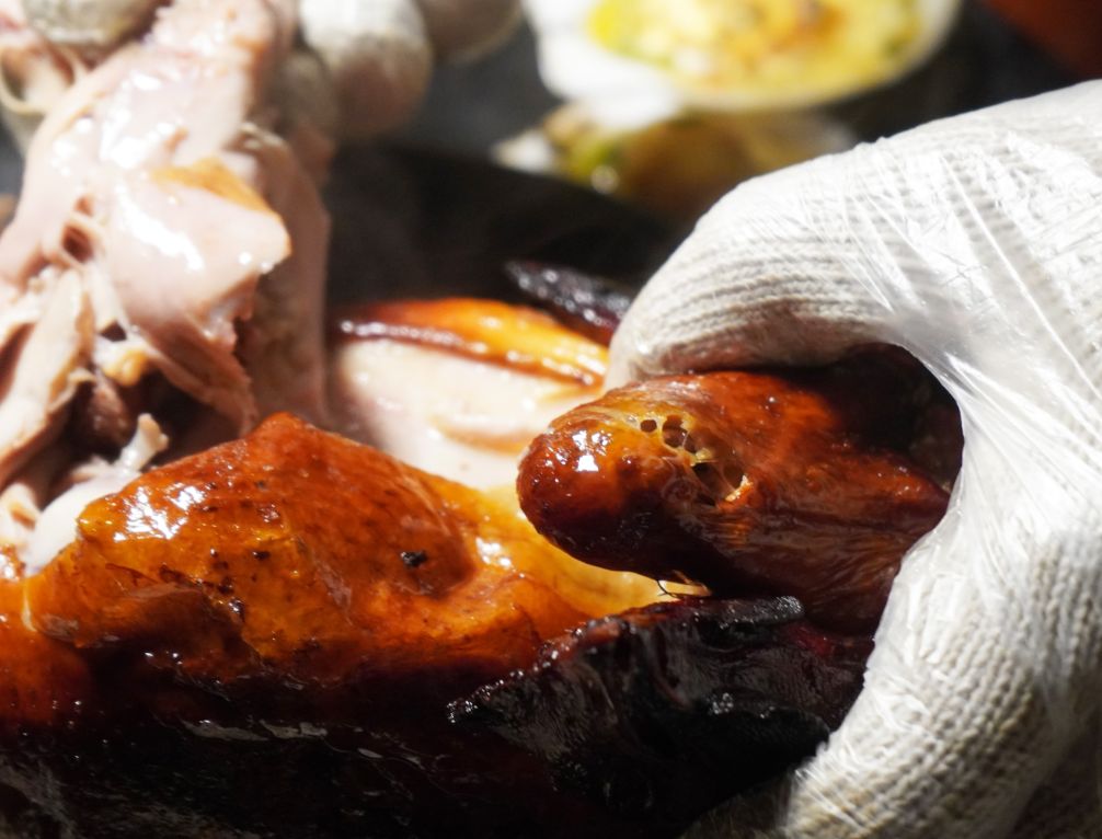 烤雞色澤金黃,帶有迷人的香氣,還附送洋蔥、雞油跟胡椒粉,套上手套跟塑膠袋,將烤雞逐一拆解,露出雪白雞肉跟滿滿肉汁,看起來好誘人啊。