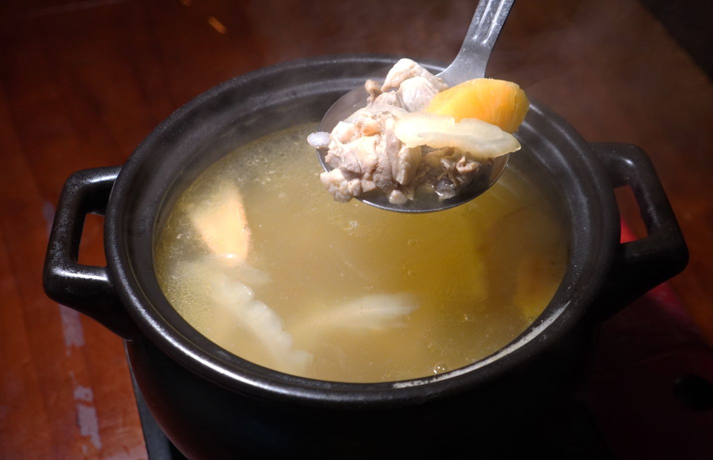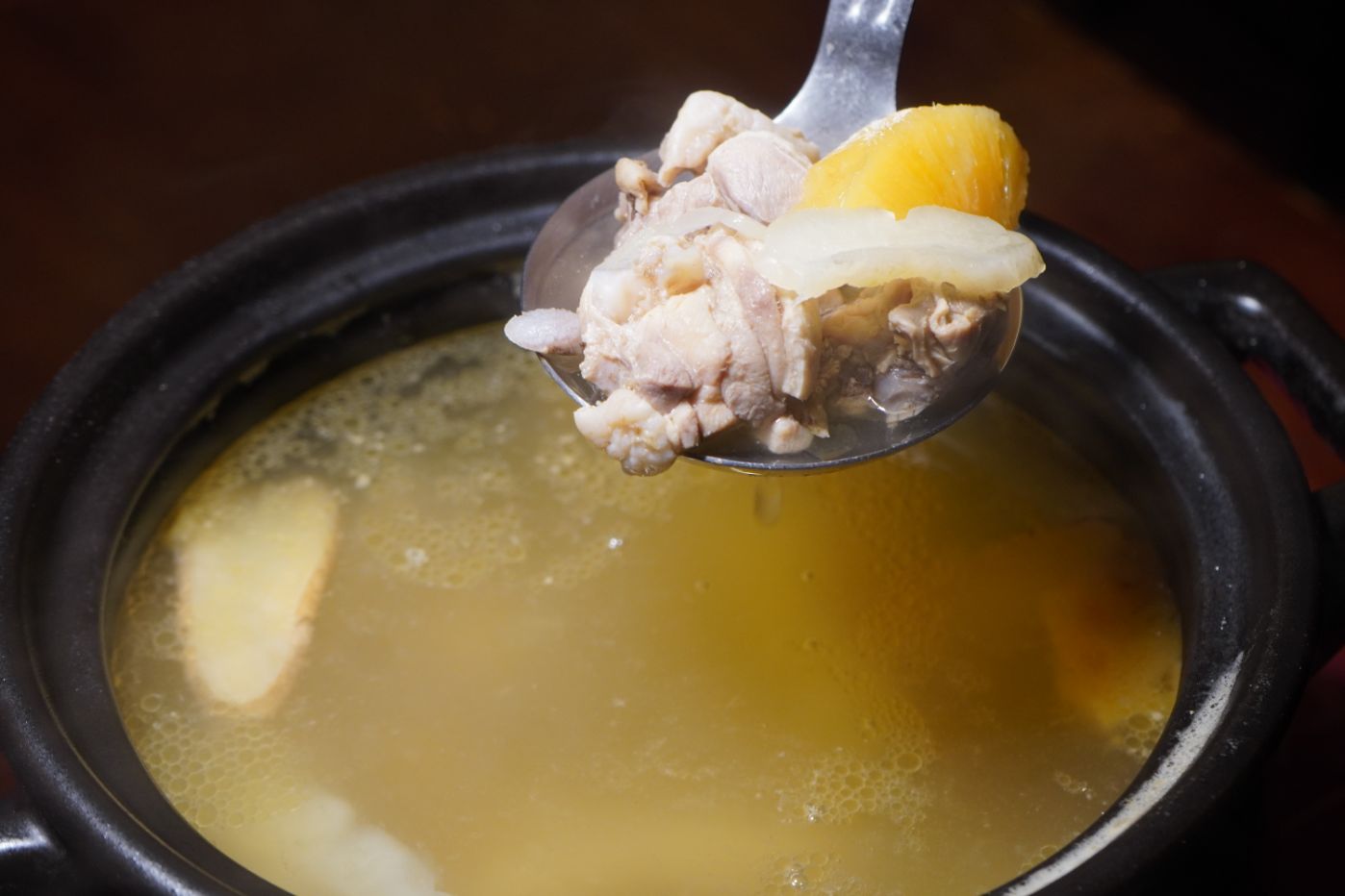 除了桶仔雞,鳳梨苦瓜雞湯鍋也是袁彬大力推薦,除了切塊的雞肉,吃起來口感Q彈,還有經燉煮的苦瓜片,大塊蔭鳳梨,可以增添湯頭的甘甜好滋味,滿滿的古早味,超好喝。