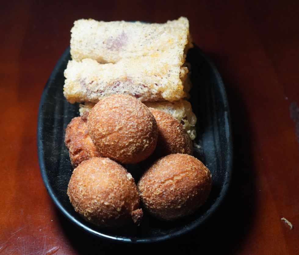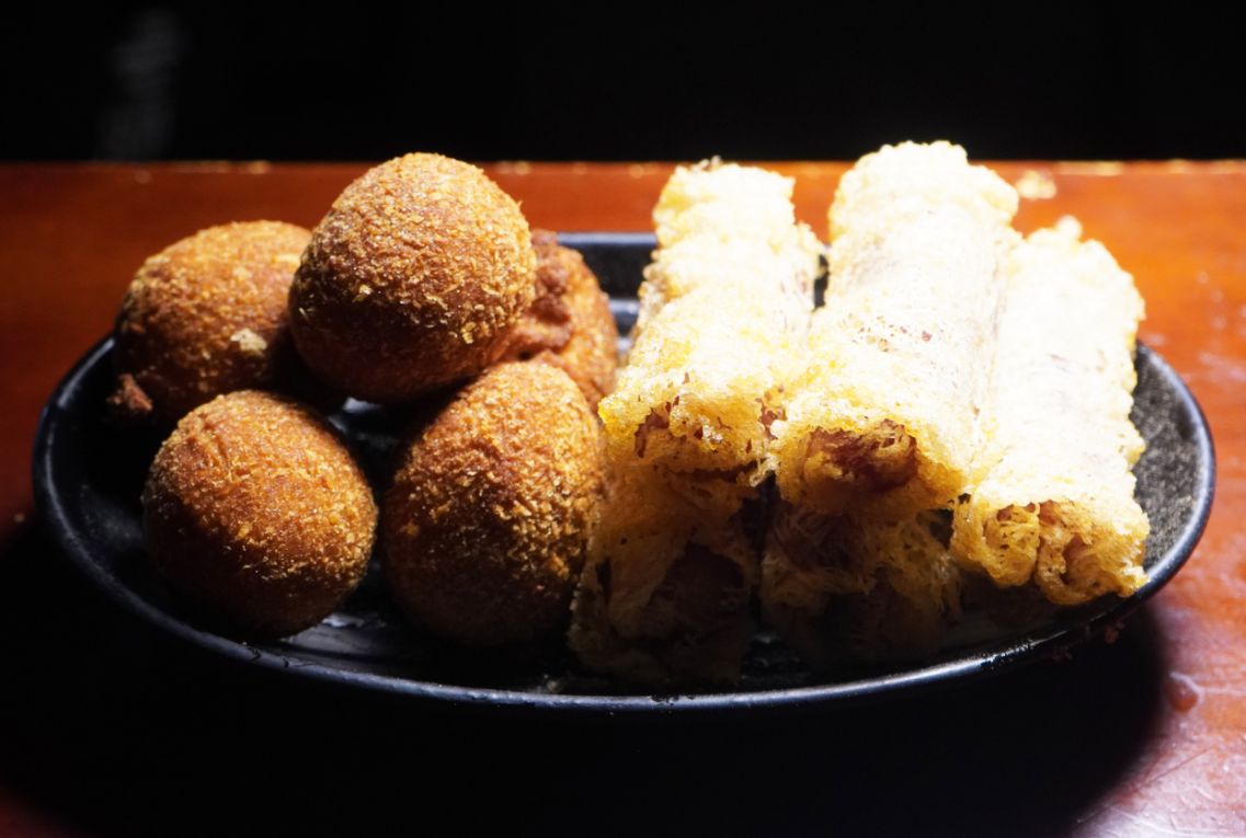咬一口芋泥起司球,可以嚐到濃郁芋香,內餡是滿出來的起司 。擺在芋泥起司球旁的是山藥捲,可以吃到口感濃厚的香甜山藥泥,與酥脆的網狀外衣相互點綴。