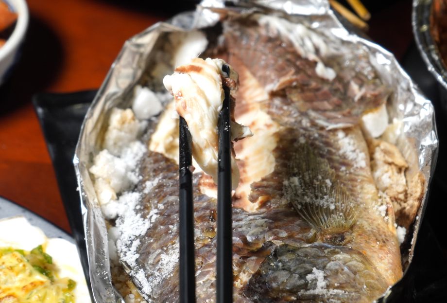 上面鋪上一層厚厚的鹽去燒烤,魚肉吃起來不柴,仍維持細嫩的口感,鹽烤帶出清甜的滋味,也是推薦必點的菜色