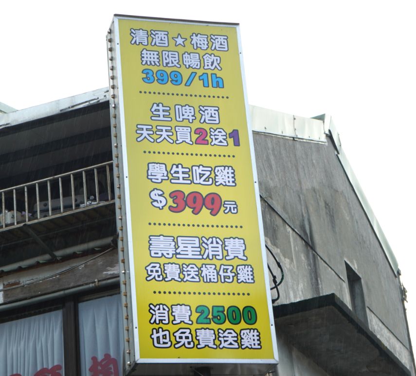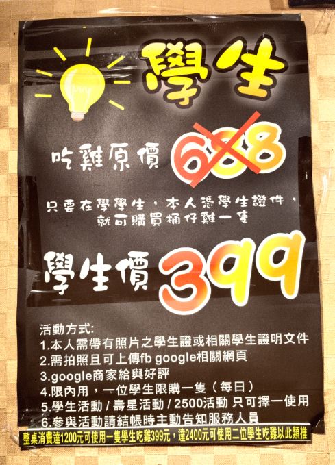 若是學生族群來士林店或萬隆店用餐,吃桶仔雞只需399元,吃串燒一定要配杯生啤酒,士林店或萬隆店也推出生啤酒買2送1的優惠。