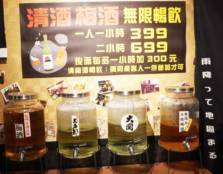 吃串燒、桶仔雞一定要配酒來喝,店家除了有生啤酒買2送1、還有清酒梅酒無限暢飲的優惠,是值得推薦的士林聚餐首選。