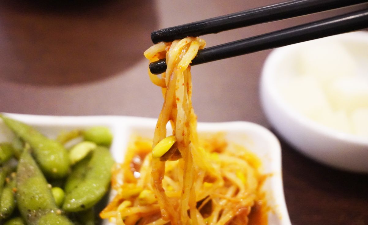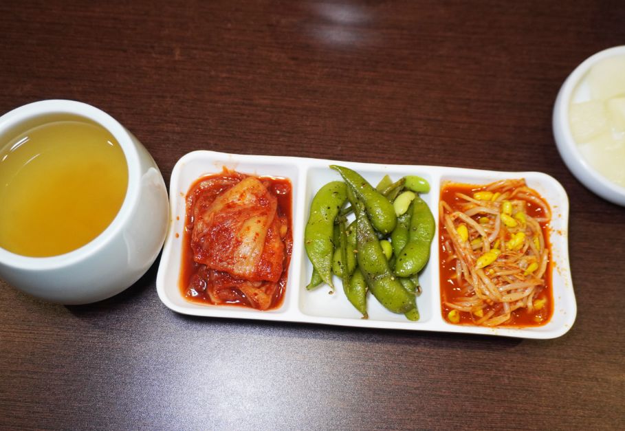 韓式小菜一共有韓國泡菜、拌豆芽以及毛豆夾,吃起來酸脆開胃。