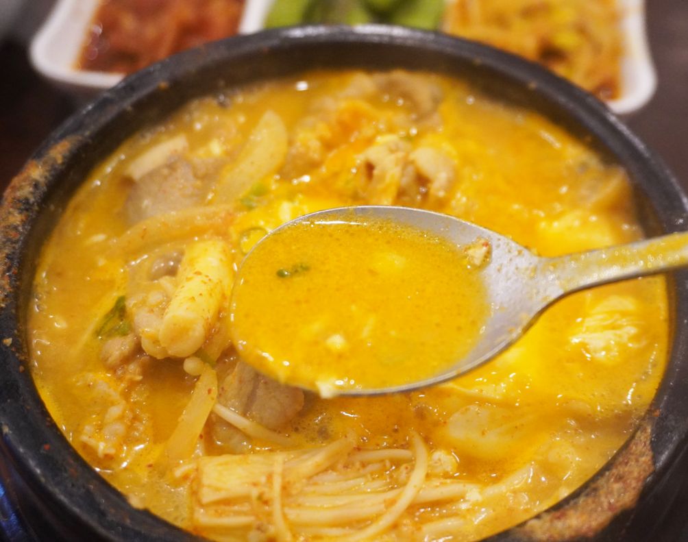 湯匙一舀,裡面有滿滿的料,可以吃到豬肉片、嫩豆腐、荷包蛋及金針菇,吃上一鍋,暖身又暖胃。