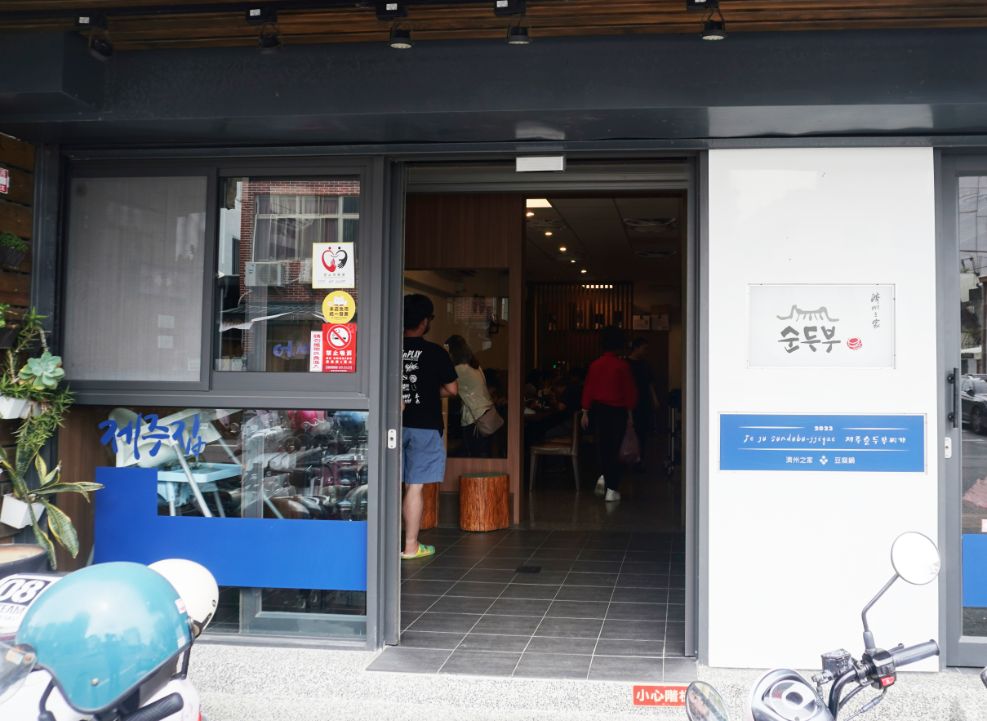 濟州之家韓式豆腐鍋台東店的店面位於長沙街,有著藍底白字的招牌。