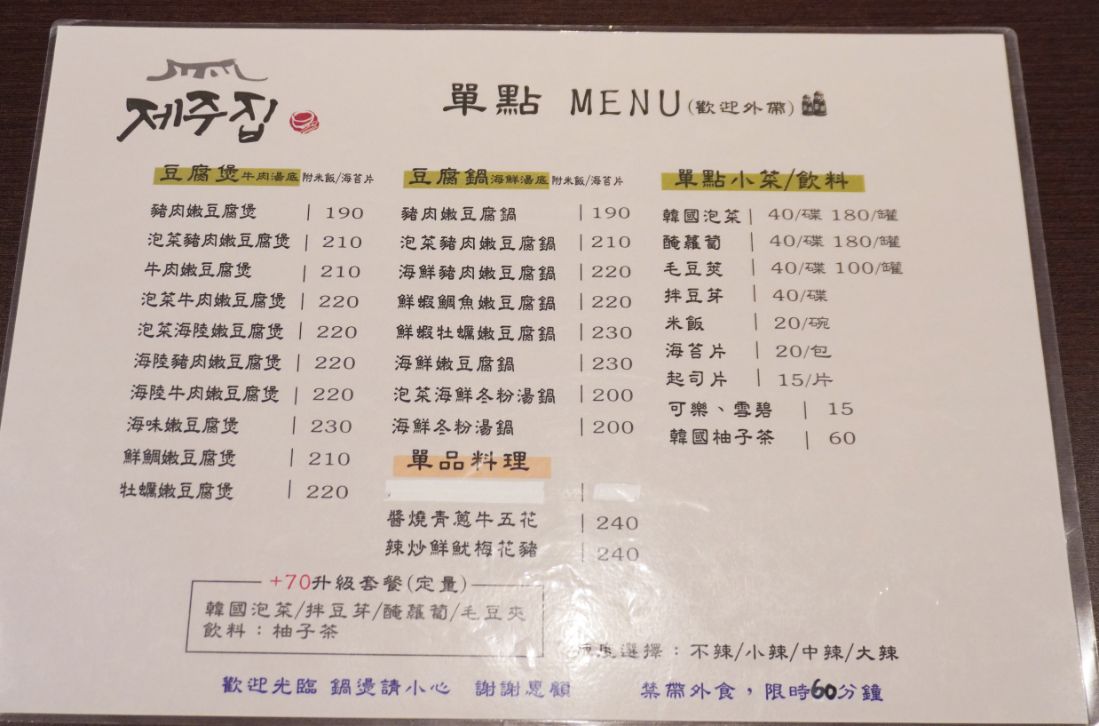 濟州之家韓式豆腐鍋台東店的菜單