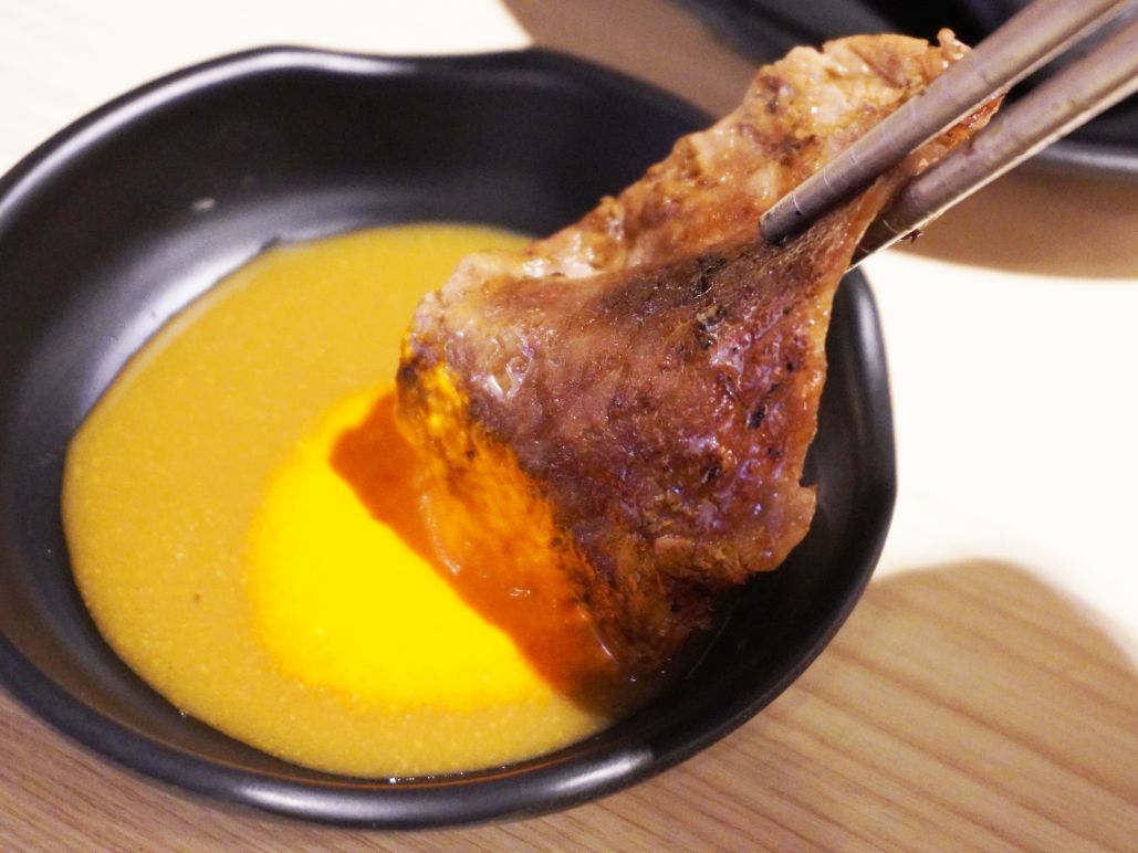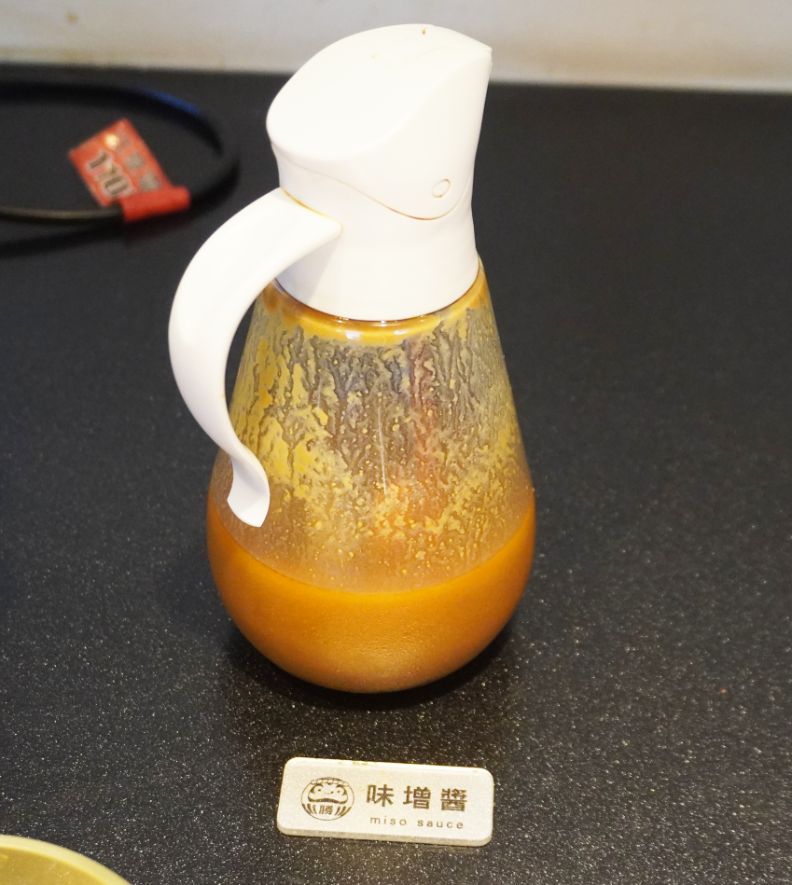 醬料選項不多,有味噌醬、辣椒醬、七味粉以及燒烤醬油等調味料,沾烤好的肉片,超美味。