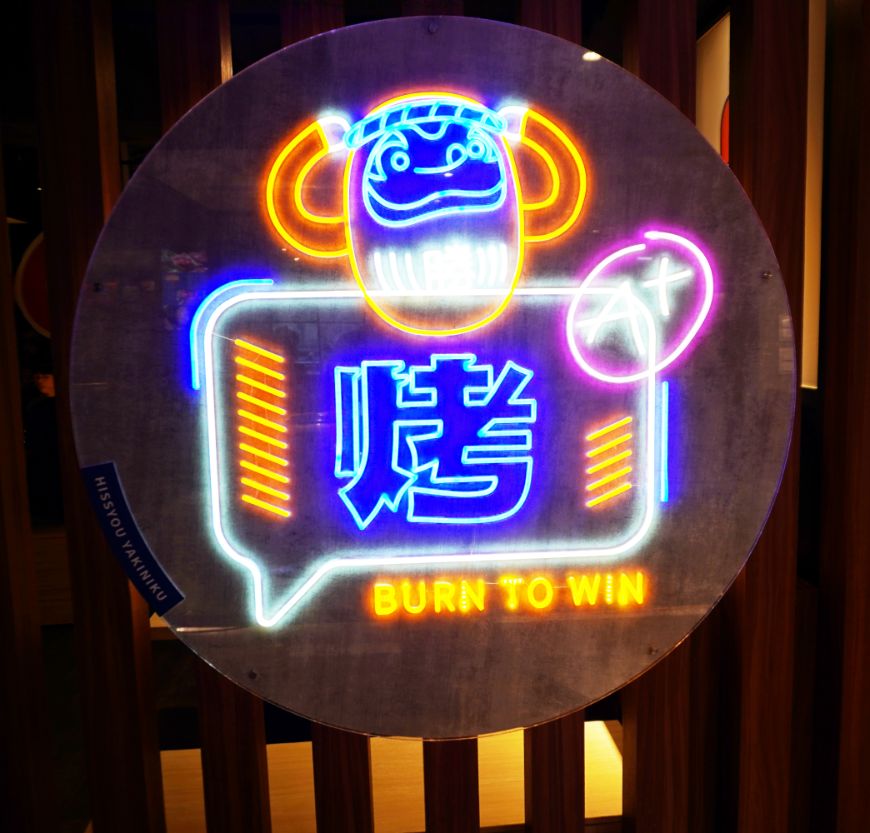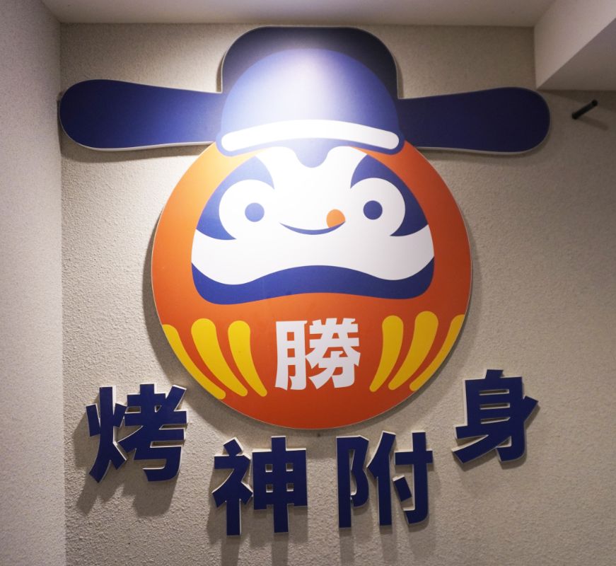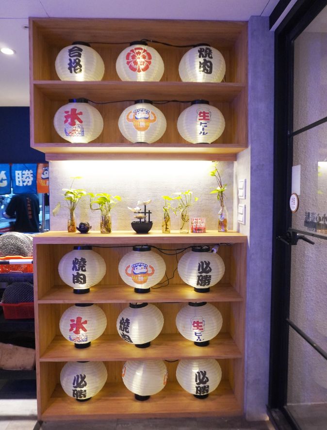 沿著樓梯走上2樓,迎面而來的是烤神附身的裝飾,走進店內,作業區外是一面日式燈籠牆,滿滿的東洋風。