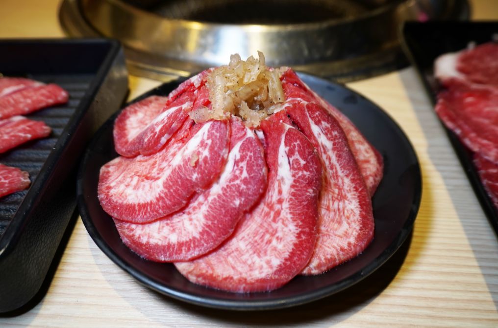 烤必勝日式燒肉(出一張嘴公館店)的肉盤都是現點現切,點799元吃到飽方案,就可以牛舌吃到飽。薄薄一片牛舌,經燒烤,帶有Q彈的口感,搭配酸菜一起品嚐,好吃。