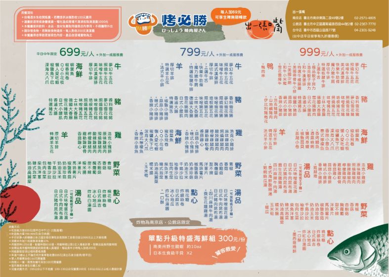 799元以及999元方案是全日供應,再外加一成服務清潔費。吃到飽方案加價69元,生啤酒無限暢飲。