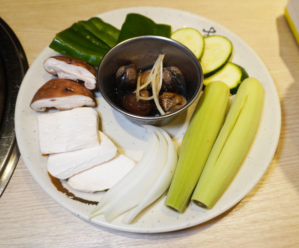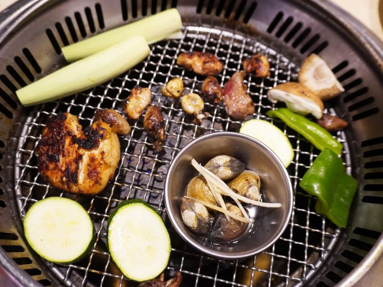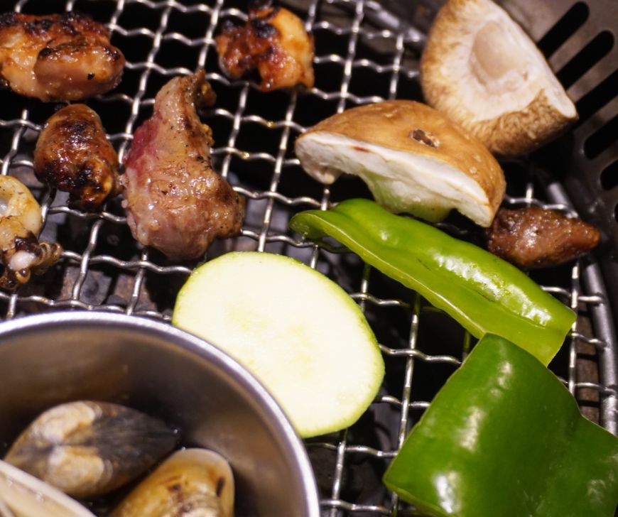 除了青椒,玉米筍,櫛瓜,還有洋蔥,香菇跟杏鮑菇,經炭火烘烤,可以吃到鮮脆的口感。
