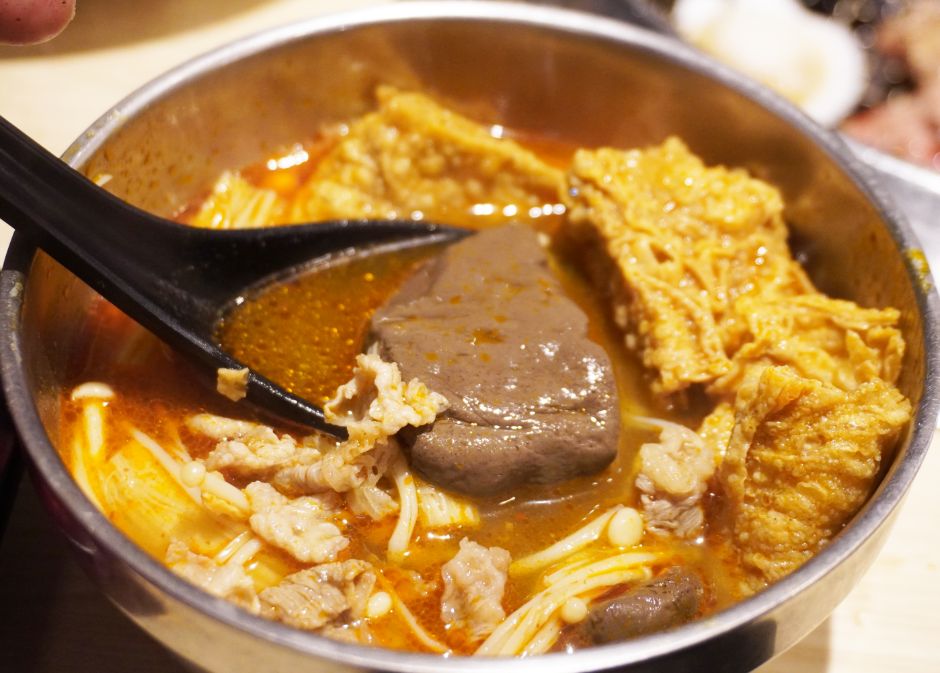 店內用餐空間寬敞,裝潢擺設有創意,準備了多個打卡背板,很適合拍照打卡,除了豐盛的燒烤食材,自助吧還有現煮湯品,可以另外加飯或加麵。袁彬最愛麻辣牛肉湯,湯頭麻辣,味道有層次,用湯匙一舀,除了鮮嫩牛肉片,還有鴨血跟豆皮,超美味的。