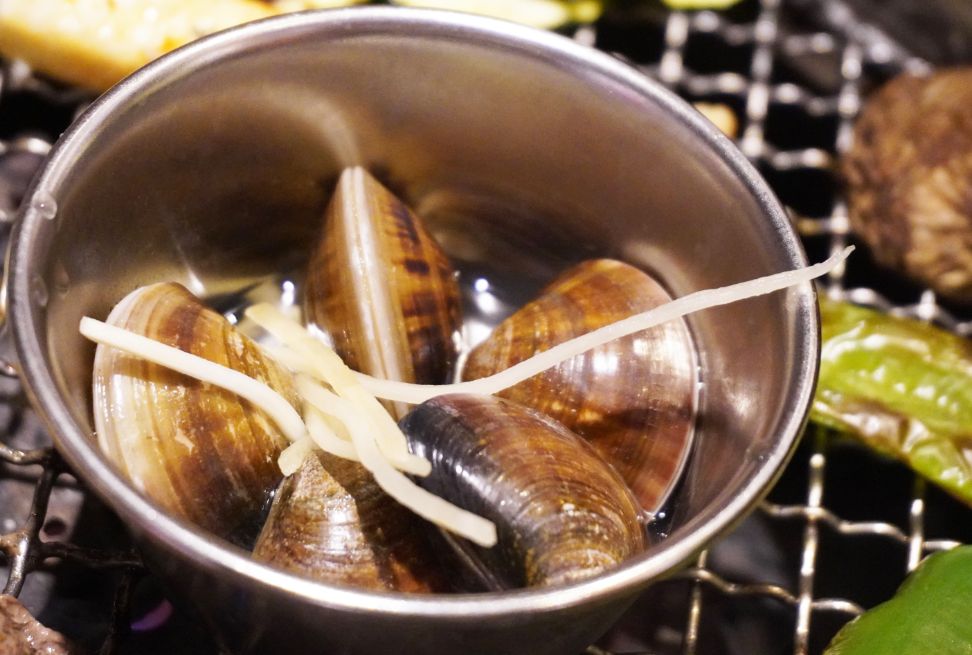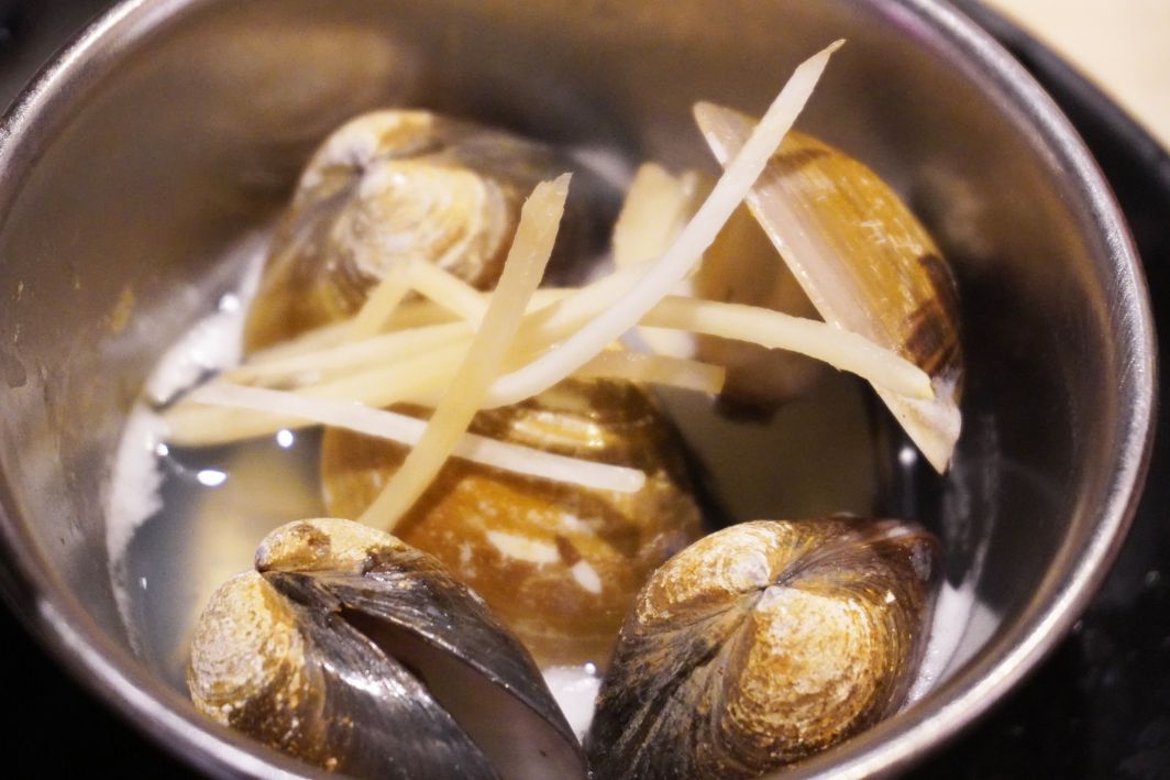 酒蒸蛤蜊,超大顆蛤蜊,擺在碗內,加入薑絲跟清酒,經過炭火燒烤,蛤蜊殼打開時,可以吃到飽滿的蛤蜊肉,喝到鮮美的湯汁。