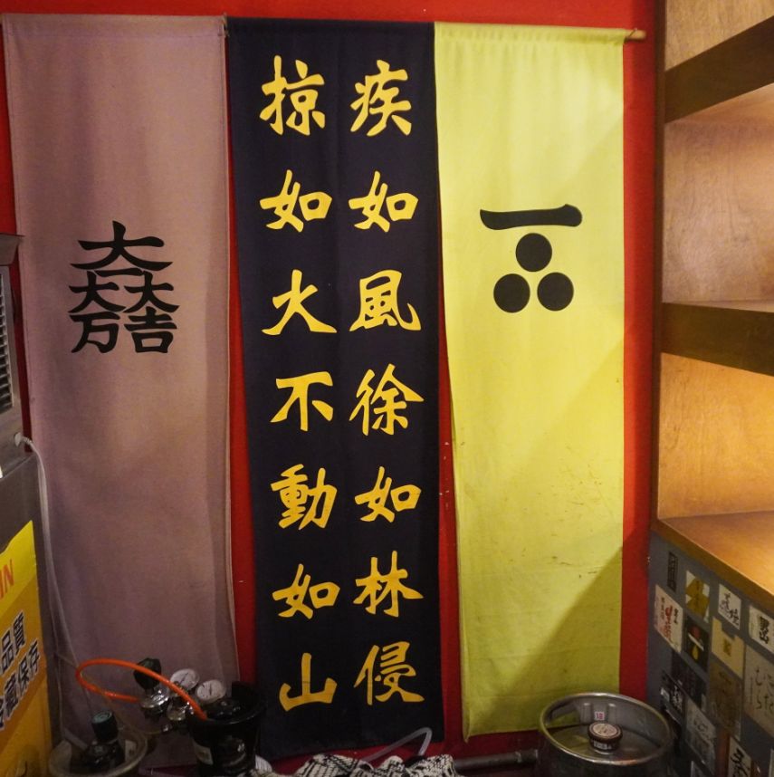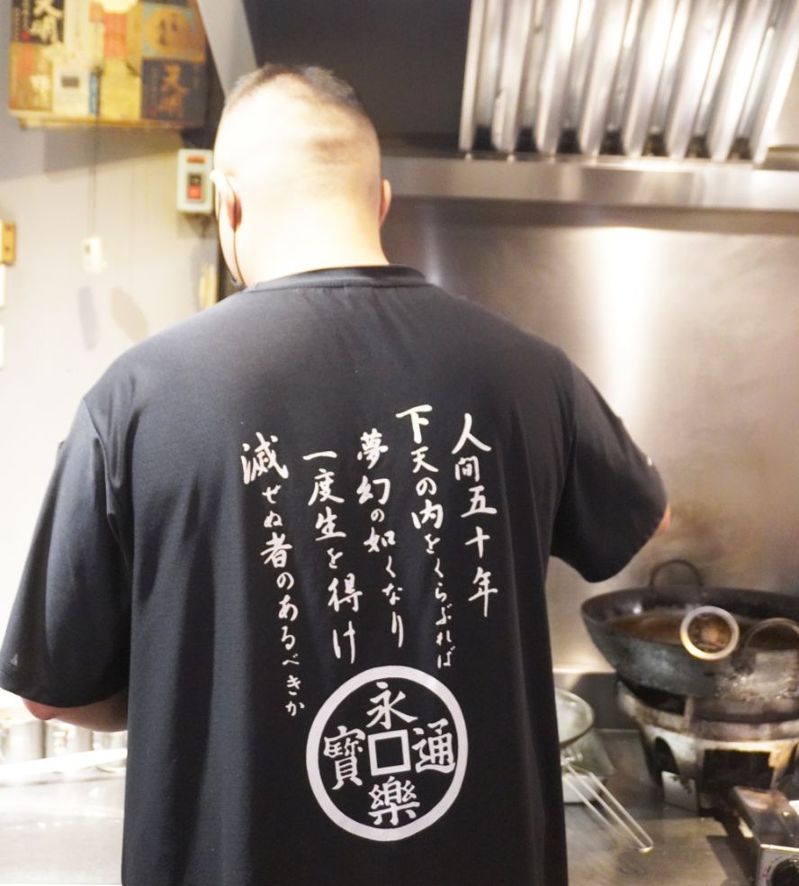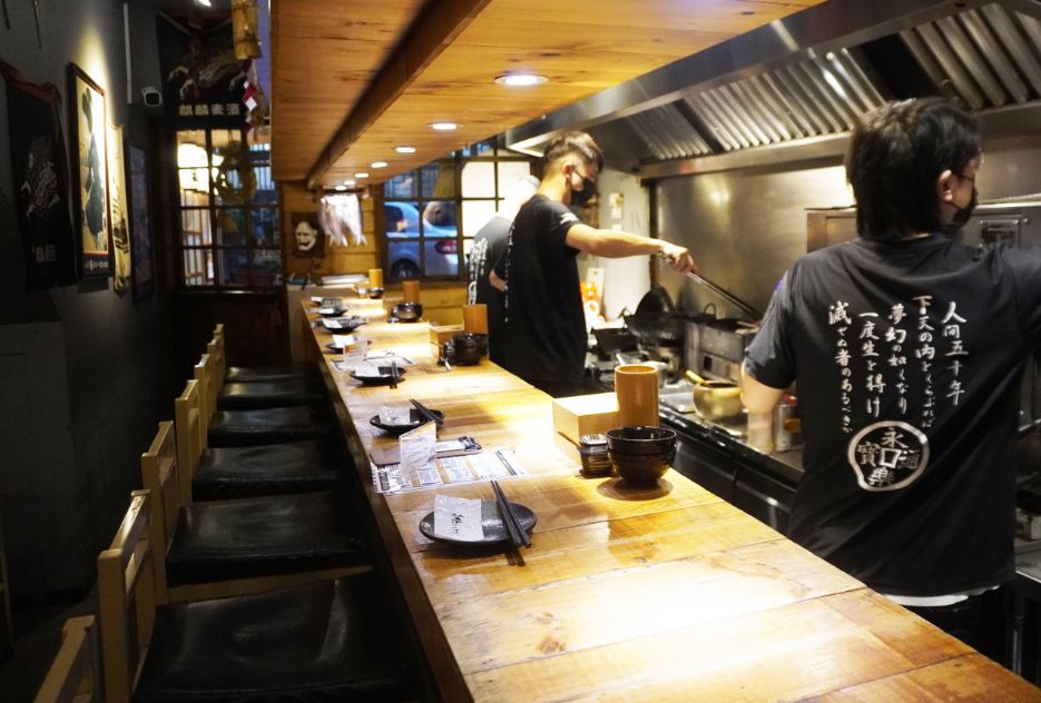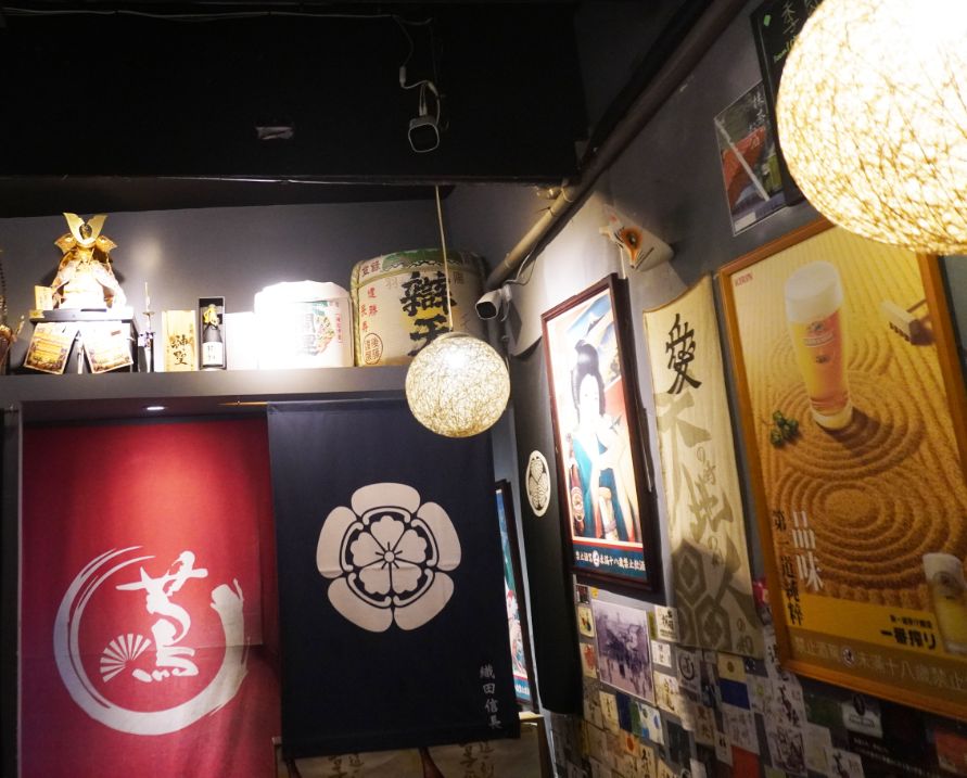 後來得知老闆喜歡日本戰國時代的織田信長,店員制服後方的文字正是出自織田信長,店內也可看到許多跟武士相關的裝飾擺設。