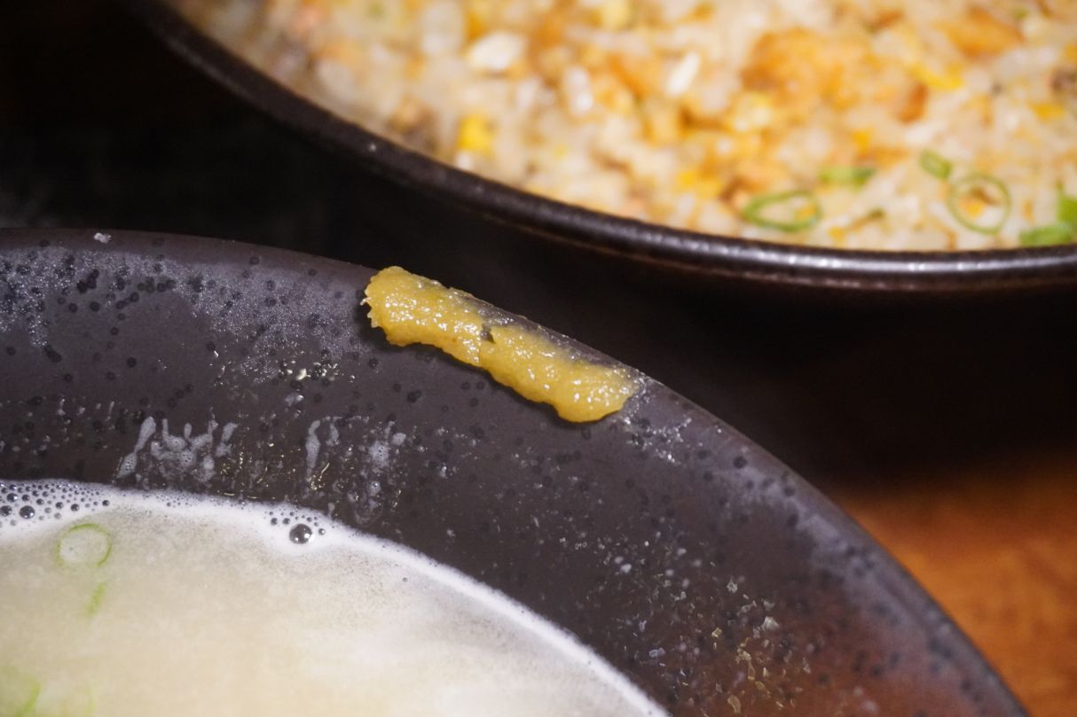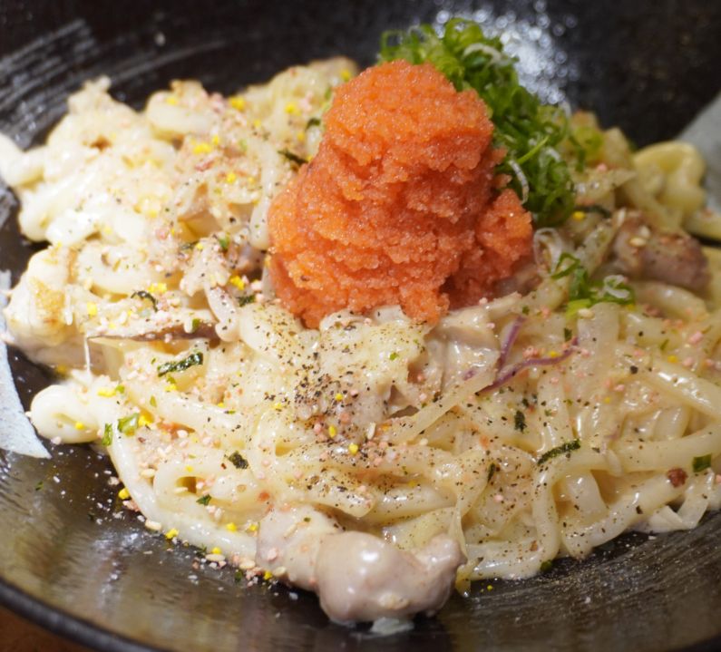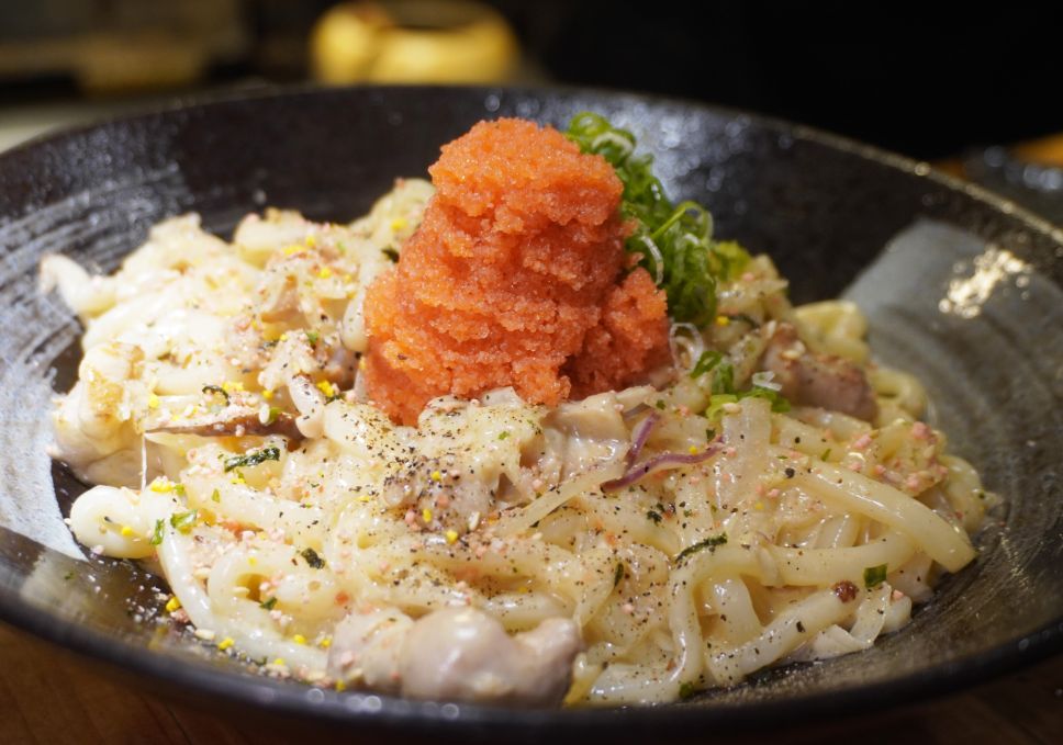 烏龍麵口感Q彈,加上雞肉跟白醬一起拌炒,上面加上滿滿的明太子醬跟蔥花,整個很澎拜。吃起來濃郁鹹甜,友人差點把整碗嗑光。