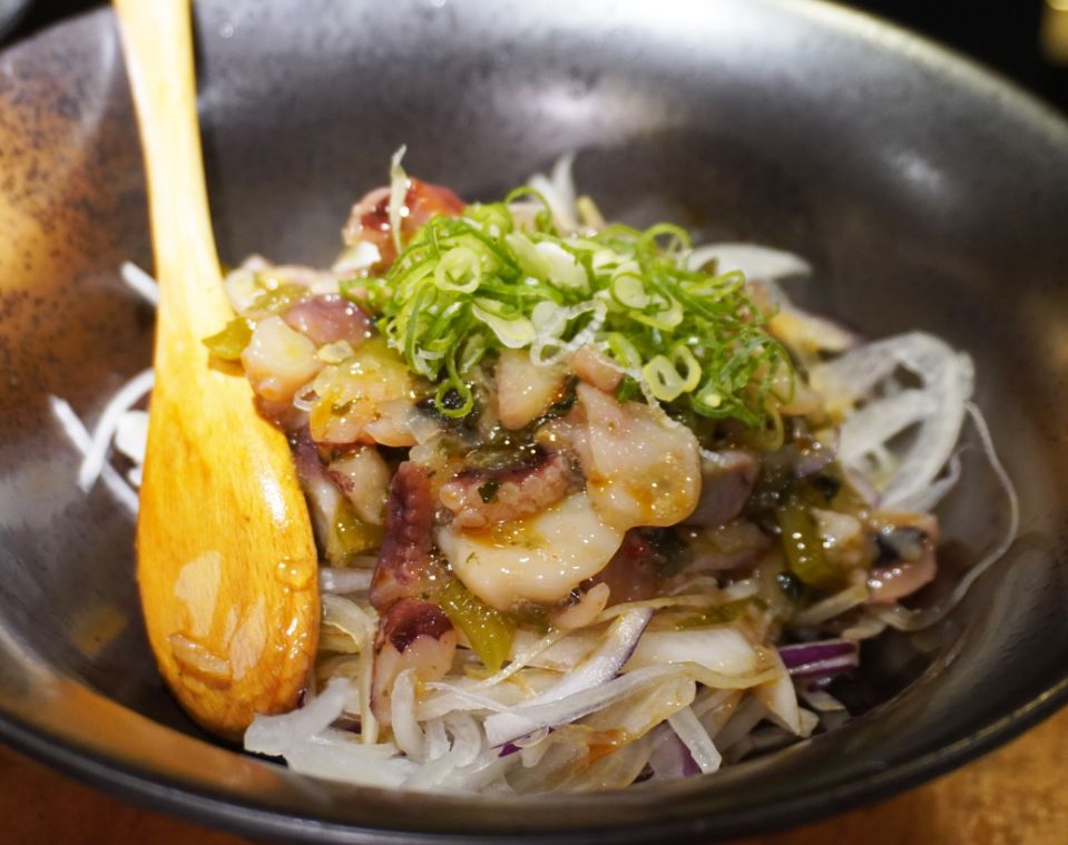 切成丁狀的章魚,混合貢菜,加上芥末及醬油等調味料攪拌一番。