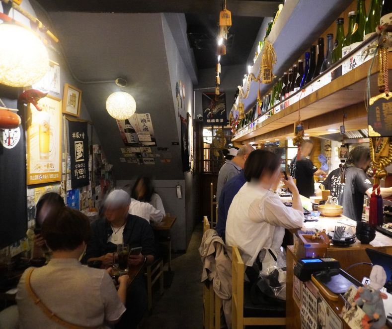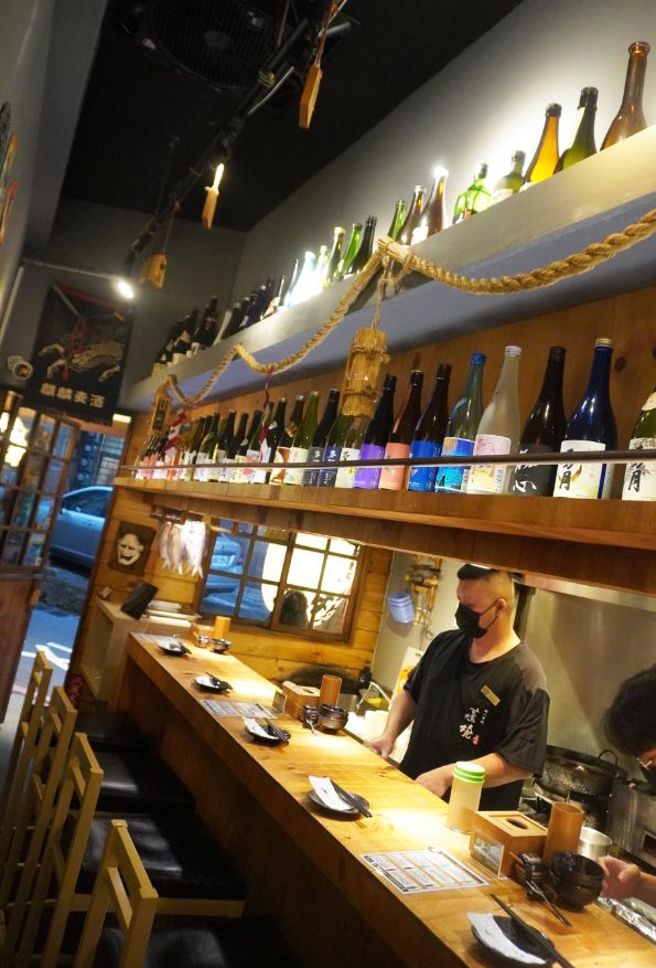 店面空間不大,開放式料理空間,可以看見廚師烹調的過程。料理區上方擺滿各式清酒,也有店家自己出產的紀念酒款。