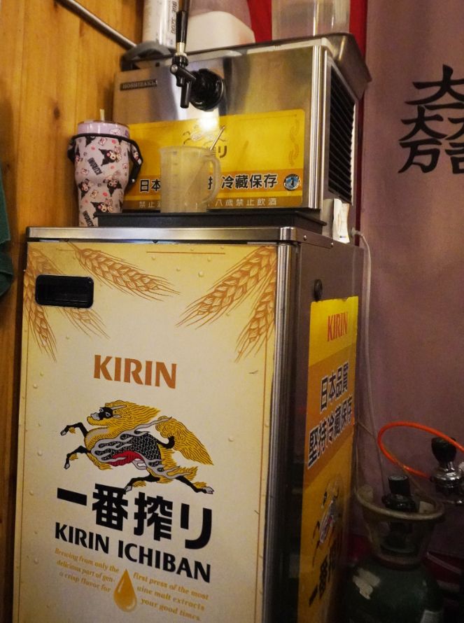 炭烤的爐子使用的是菊花炭,帶出誘人香氣。除了清酒,特製啤酒,還有麒麟啤酒的生啤酒機。