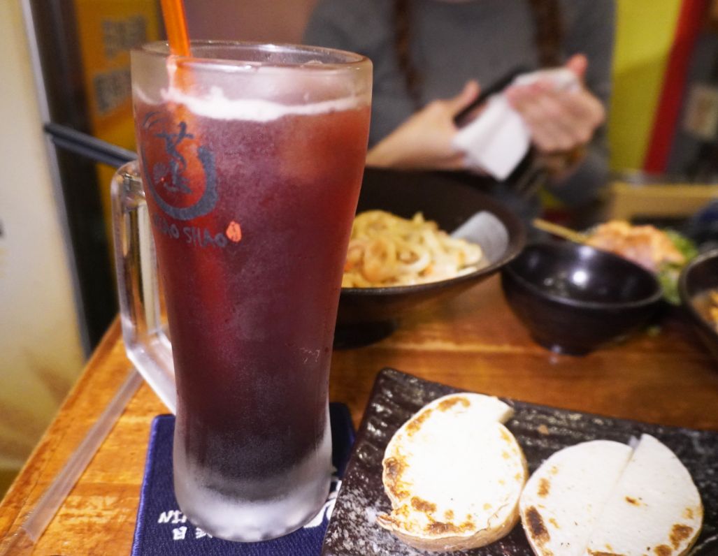 袁彬跟友人分別點了荔枝跟洛神花氣泡飲,喝起來冰涼酸甜,跟料理很搭配。