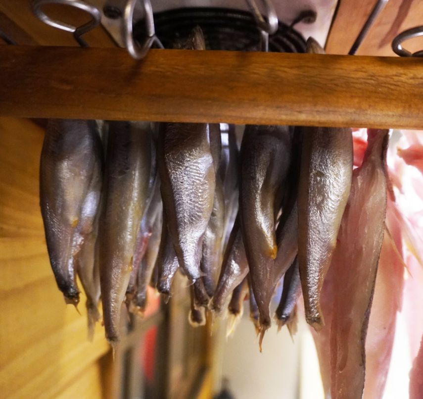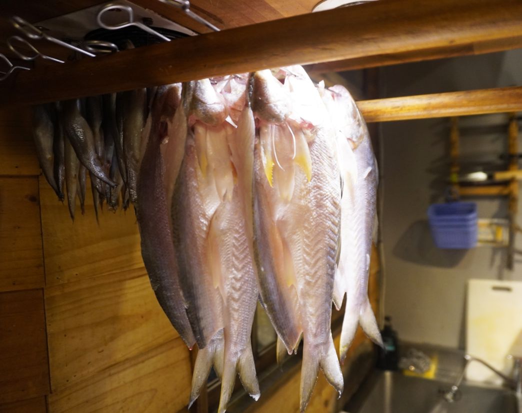 走進店內,左側是料理區,可以看到柳葉魚跟午仔魚一夜干高掛,濃厚的香氣讓人口水直流。