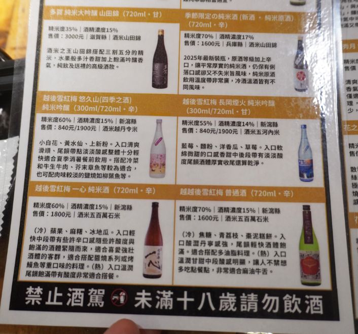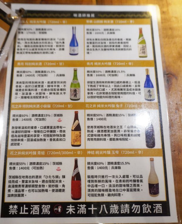作為一間日式居酒屋,入口右側牆上掛滿日式清酒的相關證書,另外還有一面在第三屆炒飯王獲得北區經典天王特色炒飯的獎狀。