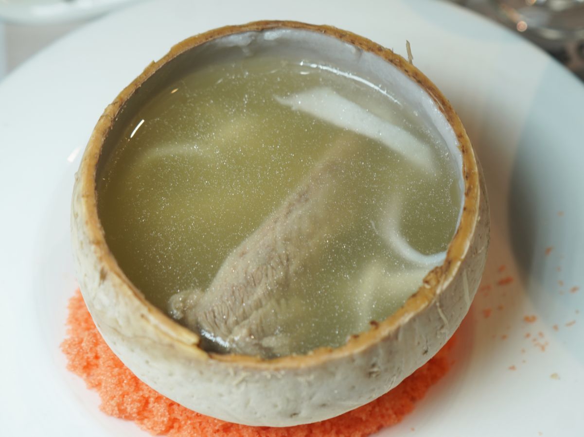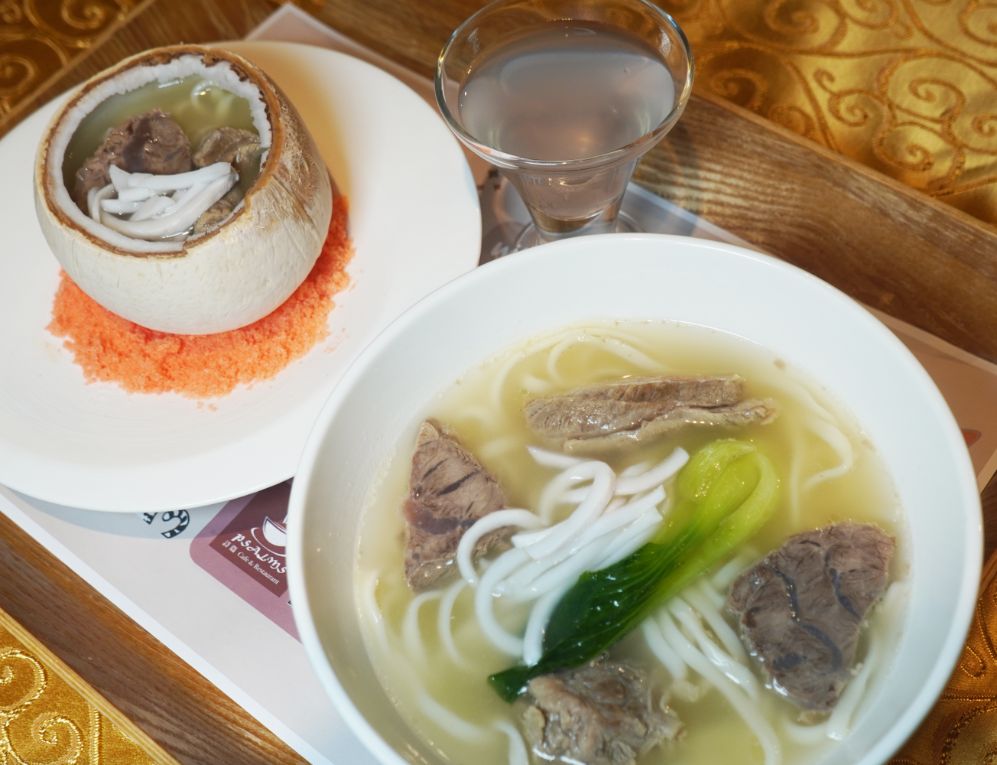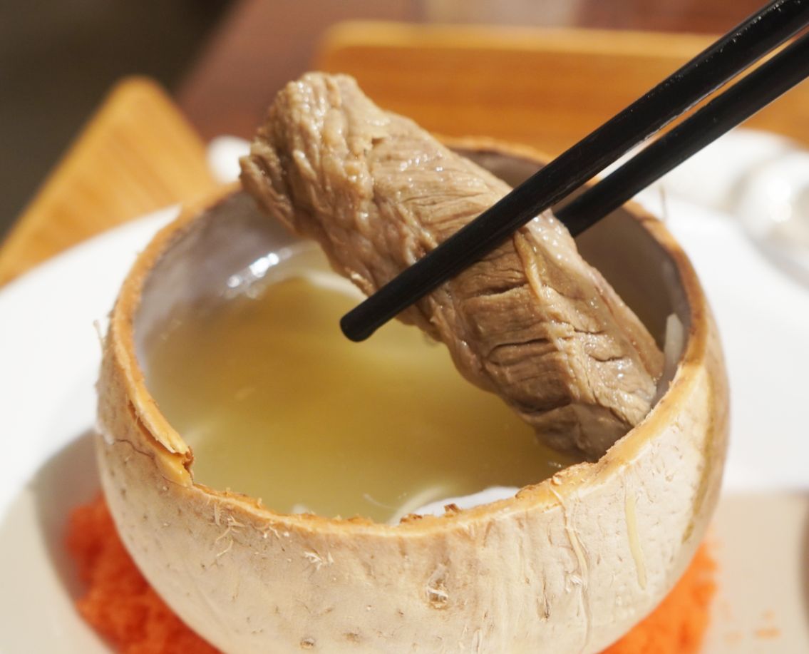 作為2023臺北牛肉麵節清燉組金牌,擺設就很有水準,除了一碗牛肉麵,還有一杯椰子汁,椰子殼做成的小碗。