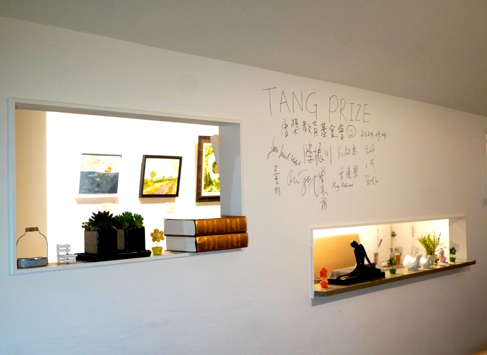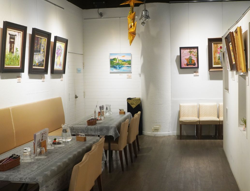 沿著櫃台走進用餐區,櫃台可以看到許多基督教的字樣跟聖經裝飾。用餐空間寬敞,牆面正進行藝術展覽活動,精美的畫作增添了用餐的氣氛。