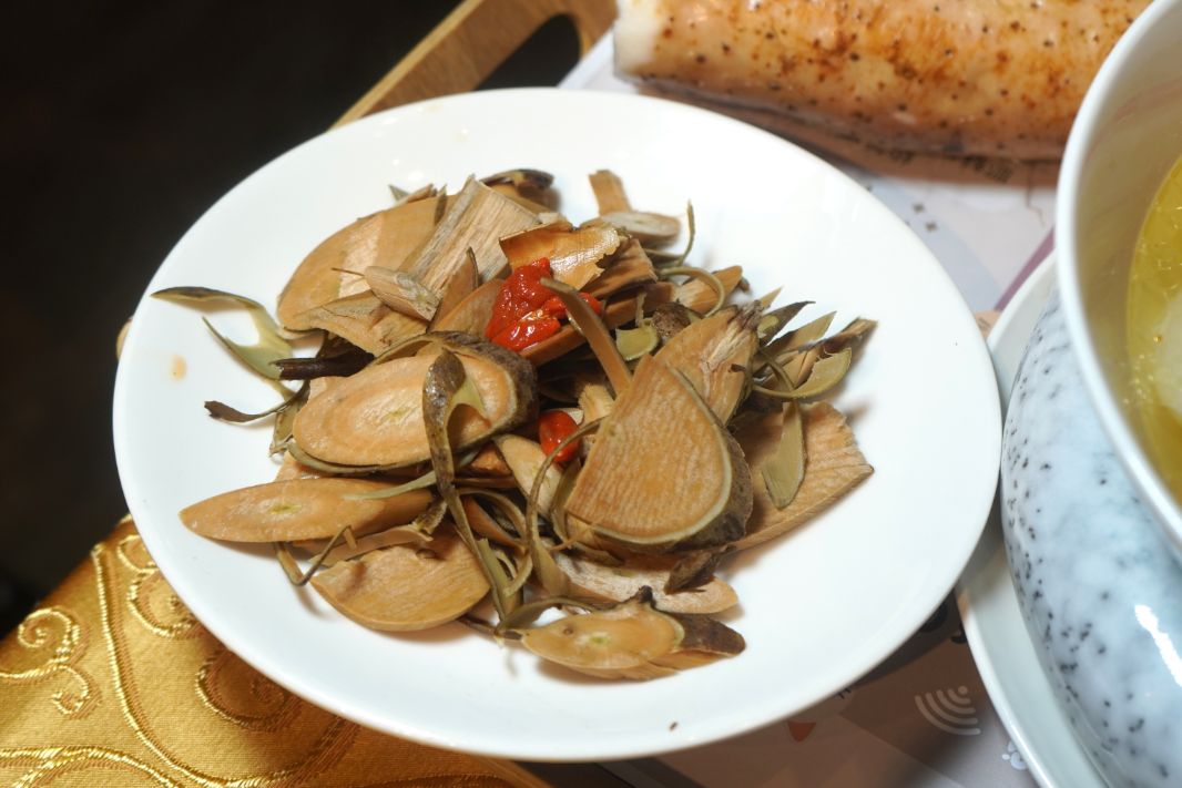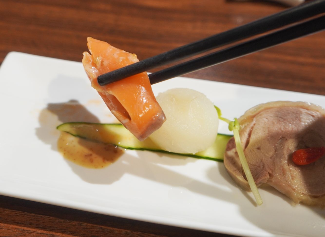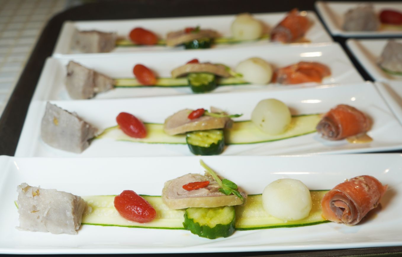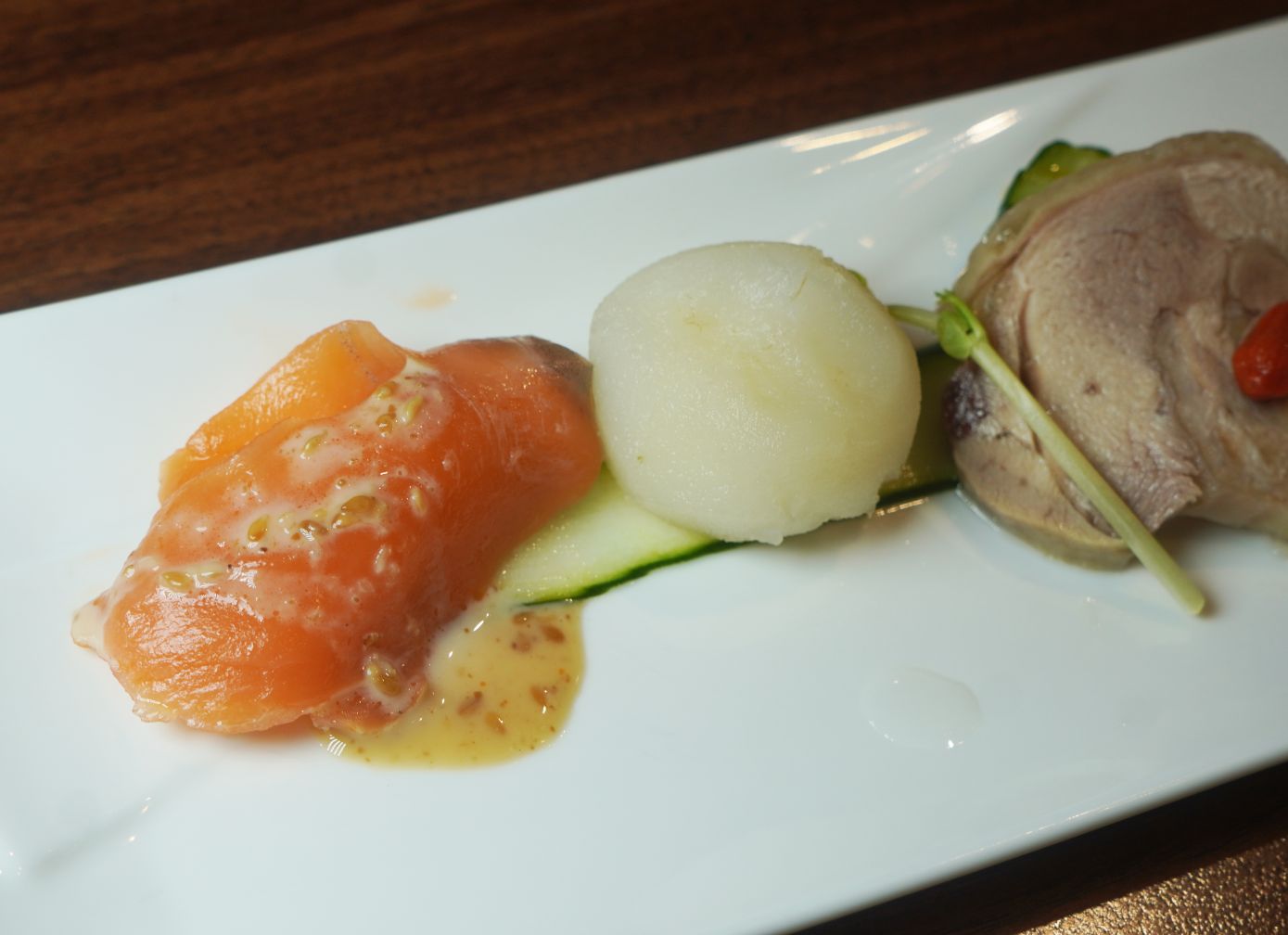 套餐還包括一組前菜,分別有大甲芋頭,梅子番茄,醉雞及鮭魚等料理。