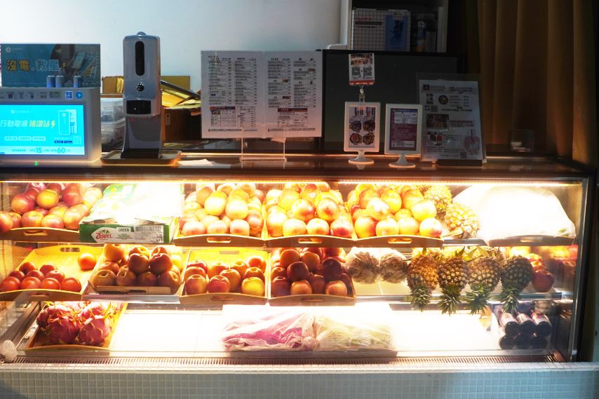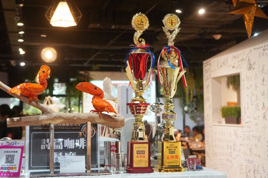 走進店內,右側玻璃櫃可以看到蔬果等食材,左側櫃台則擺放兩個牛肉麵節獲獎的獎盃。