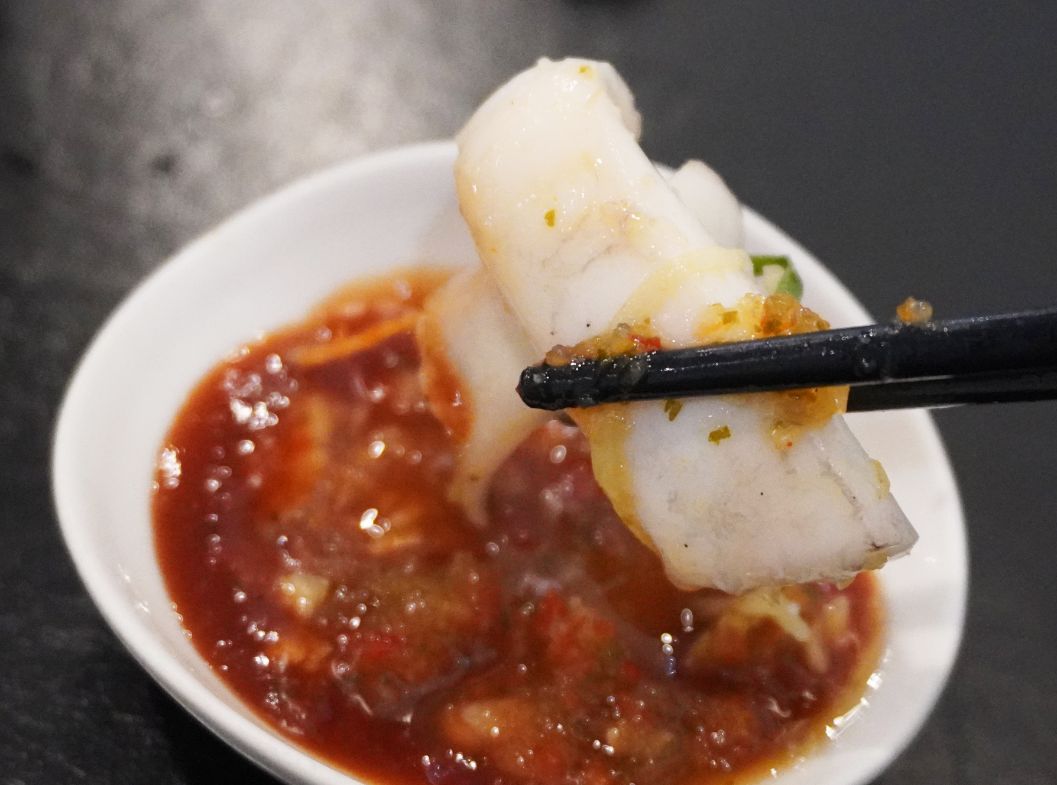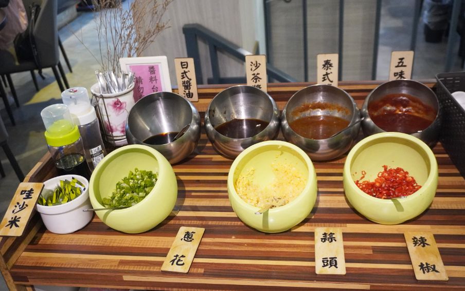 吃清蒸海鮮,一定要配沾醬。醬料區除了常見的蔥花、哇沙米,蒜頭以及辣椒,另外還有泰式醬,五味醬以及薑醋醬,配海鮮都加分。
