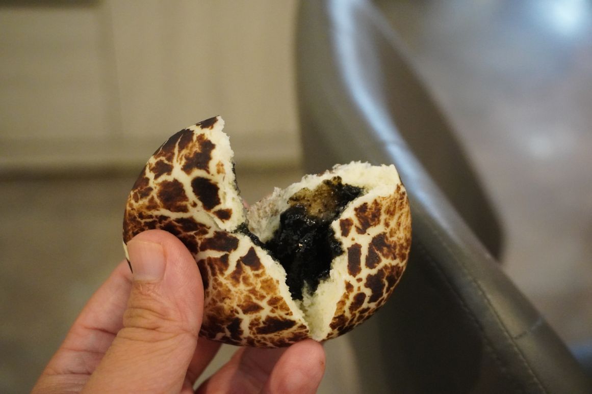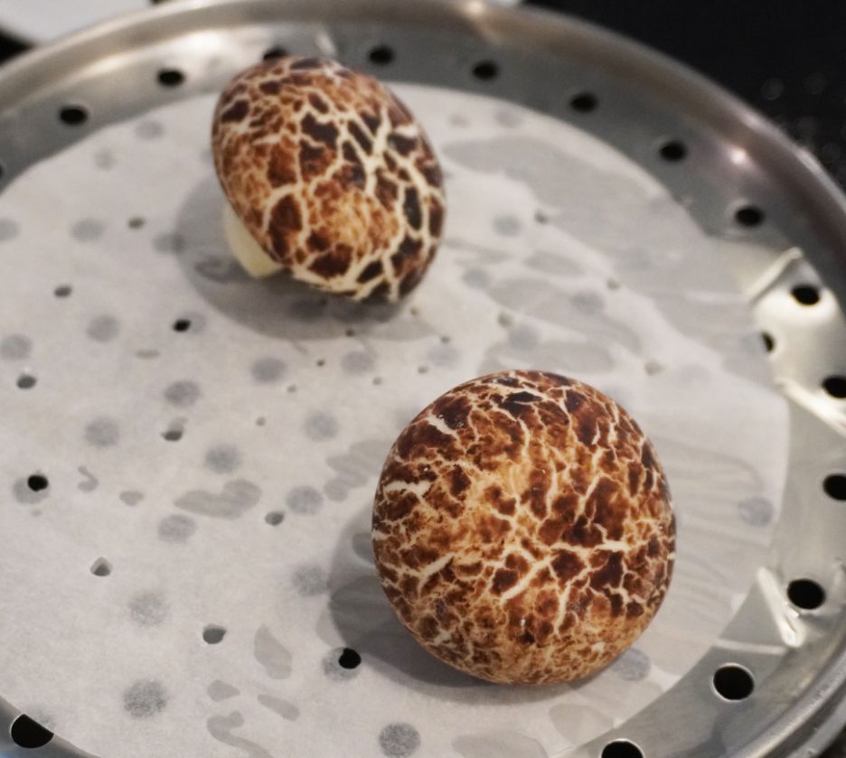 香菇造型的芝麻包,將其剝開,裡面有滿滿的芝麻餡。在用餐過程中,還發生一件趣事,友人誤以為萌菇芝麻包是要煮的香菇,還把他丟進火鍋內煮,直到店員看到提醒她。