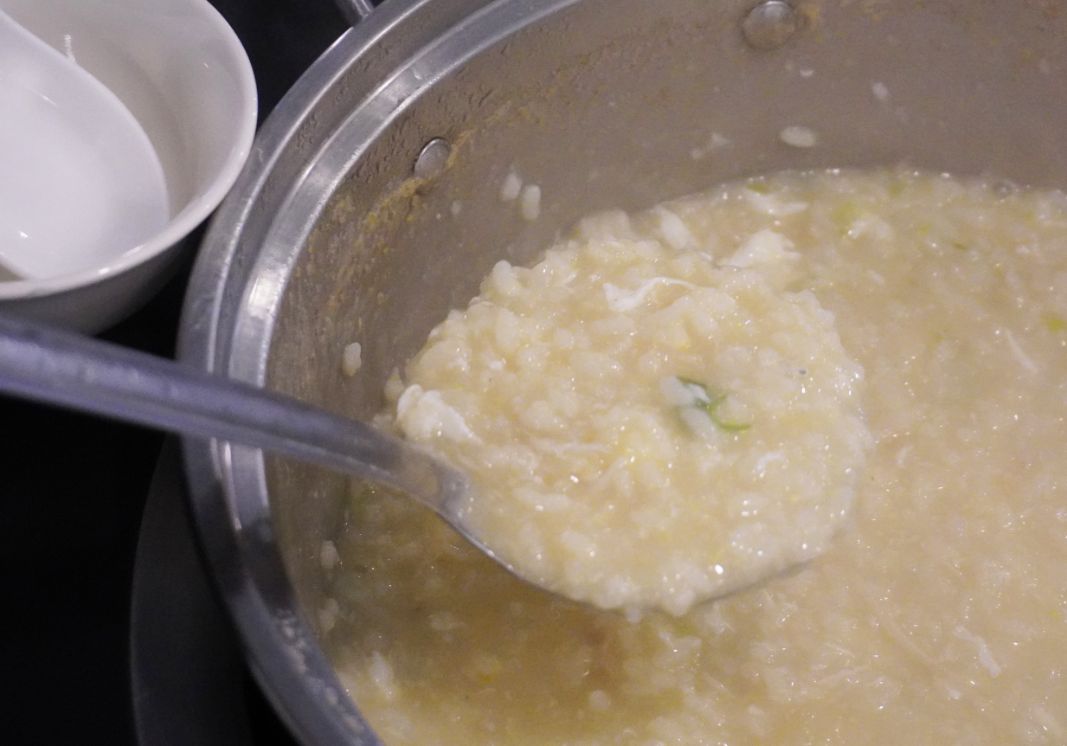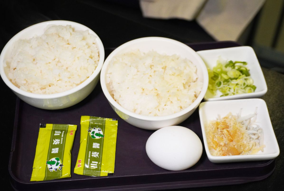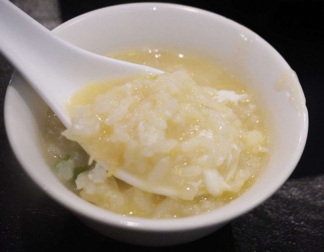 店家準備了白飯,雞蛋,蔥花,小魚干以及干貝絲,準備倒入湯中做成粥,吃起來層次豐富。