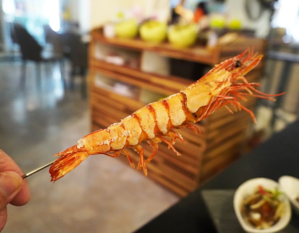 因為袁彬點的是雙人套餐,所以提供兩尾烤蝦,跟著毛筆擺在一起懸掛,擺盤超吸睛,經過鹽烤,仍保留蝦肉的鮮甜多汁,非常好吃。