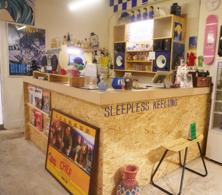 老闆身材壯碩,工作經驗豐富,除了電影劇組,還待過策展跟品牌設計等公司,店內牆壁的布置擺設都是他的收藏。