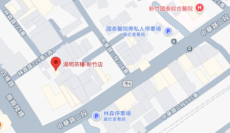 湯明茶樓新竹店位於林森路229巷內,從新竹火車站沿著中華路二段步行8分鐘,在振興路橋下右轉至四維路,最後從林森路229巷1弄右轉進入即可到達。也可以搭5801、5802等公車到國泰醫院站。鄰近新竹國泰綜合醫院,附近有林森停車場、新竹國泰綜合醫院停車場以及四維停車場,開車的朋友停車也很方便。