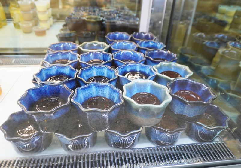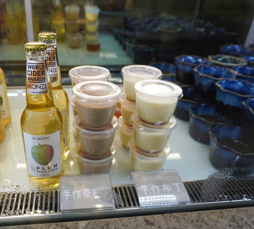 玻璃櫃內除了擺放台灣茶,還有手作布丁跟手作茶凍。