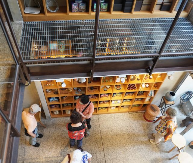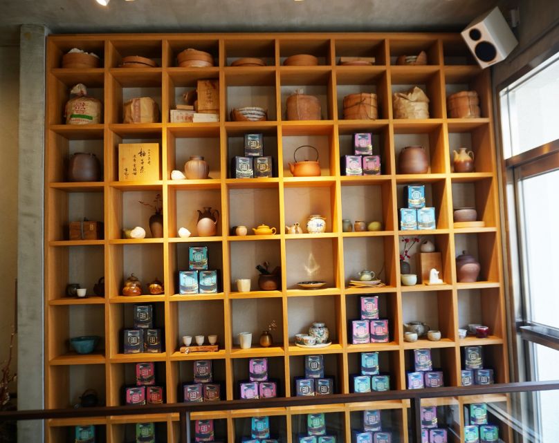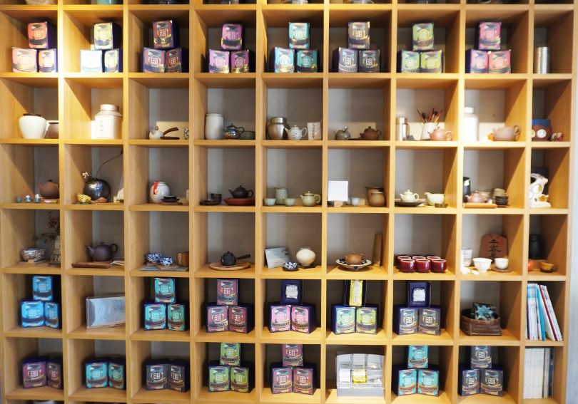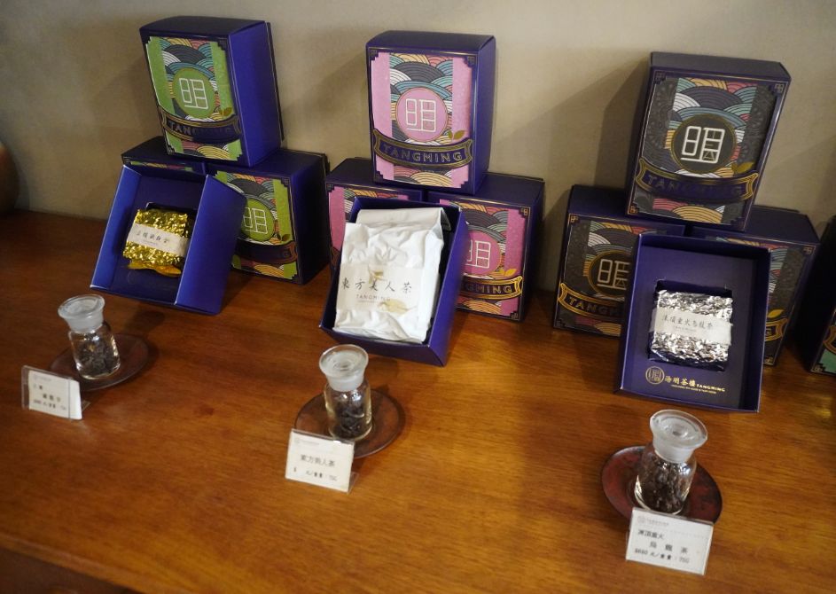在湯明茶樓,除了有多款茶飲可以品飲,也有台灣優質好茶的茶葉可以選購。在右側牆面,就有一整面茶牆垂直貫穿一二樓,在格子內,擺放台灣茶、茶具及茶葉等商品。