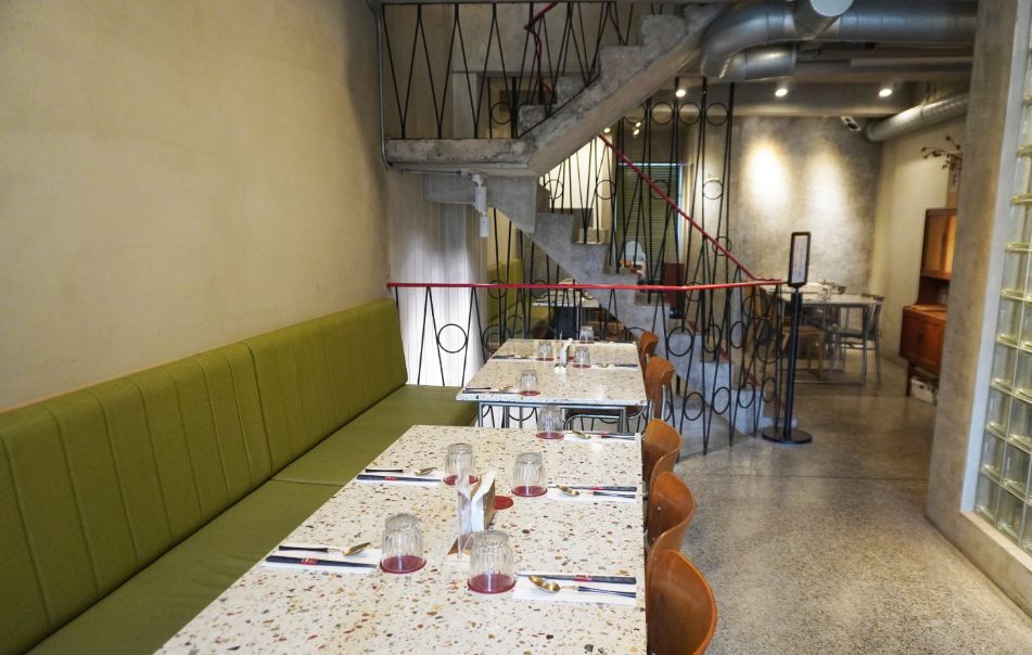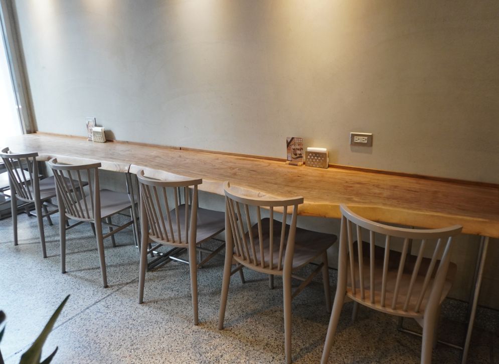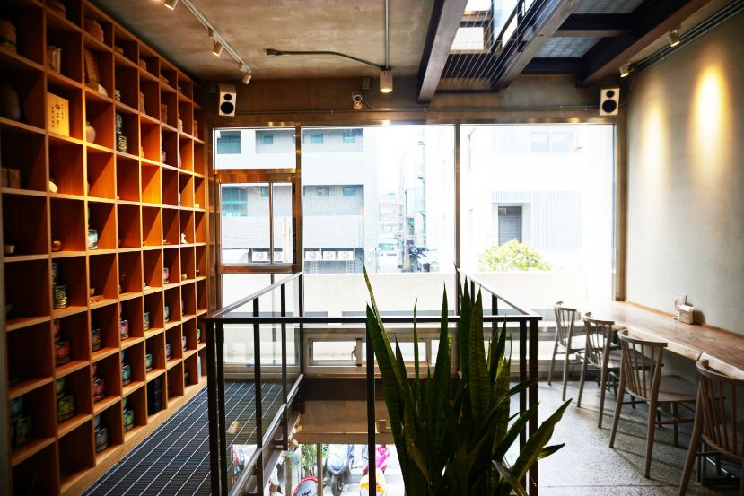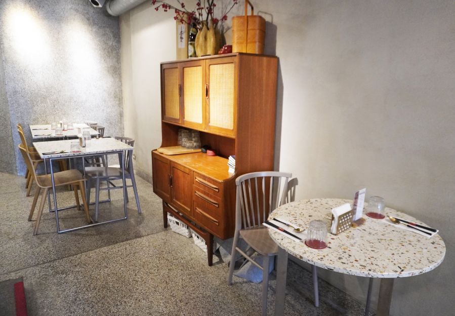 沿著工業風的階梯走到2樓,以磨石子跟老物件營造出舒適的用餐空間,右側則有木製長桌,很適合單身族用餐。