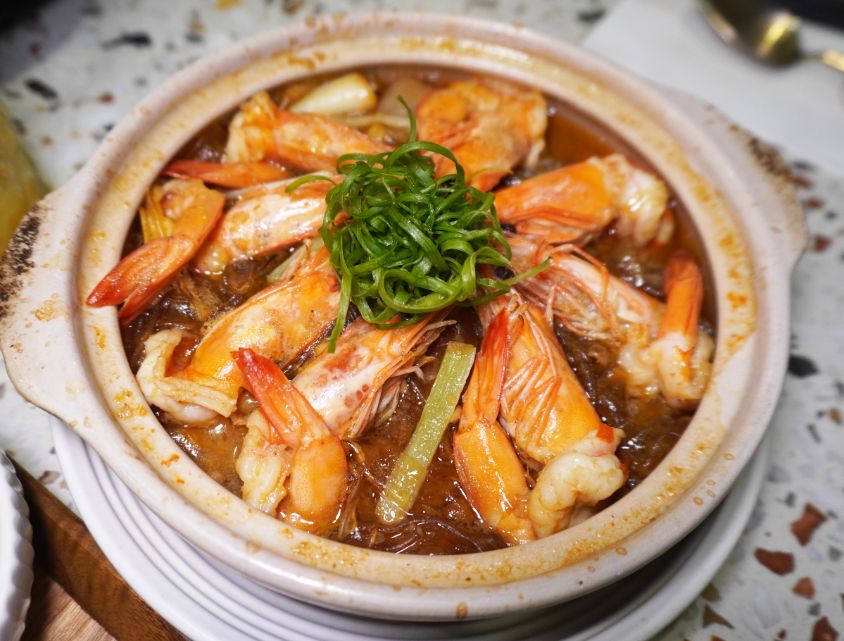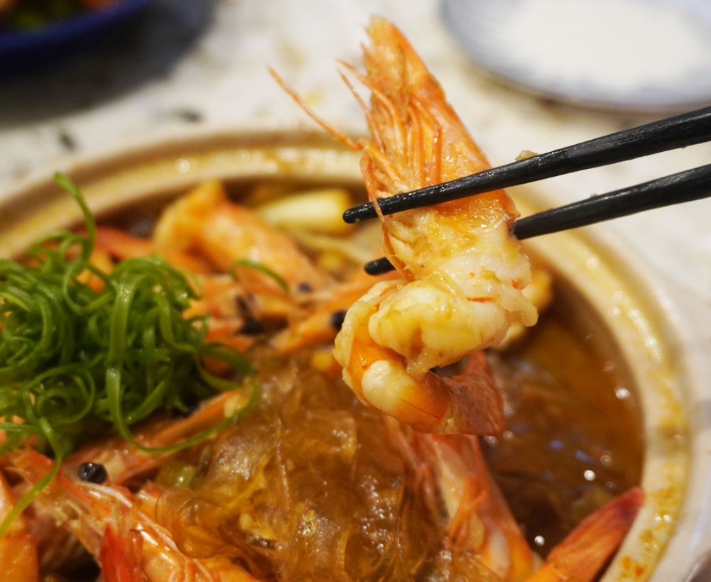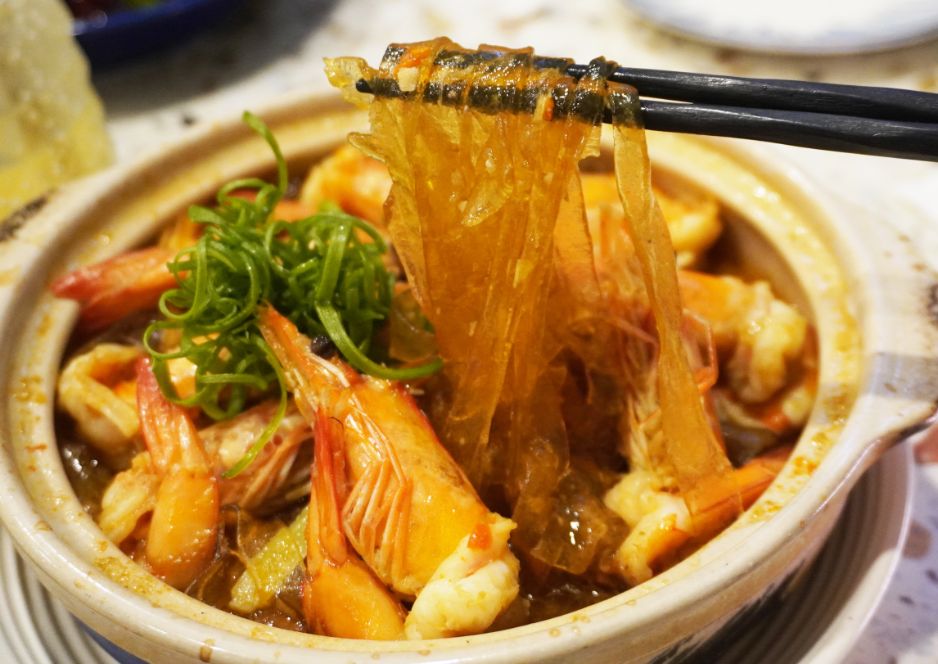 以粉絲跟豆腐鋪底,上面擺上剝殼的鮮蝦跟蒜蓉進行料理。