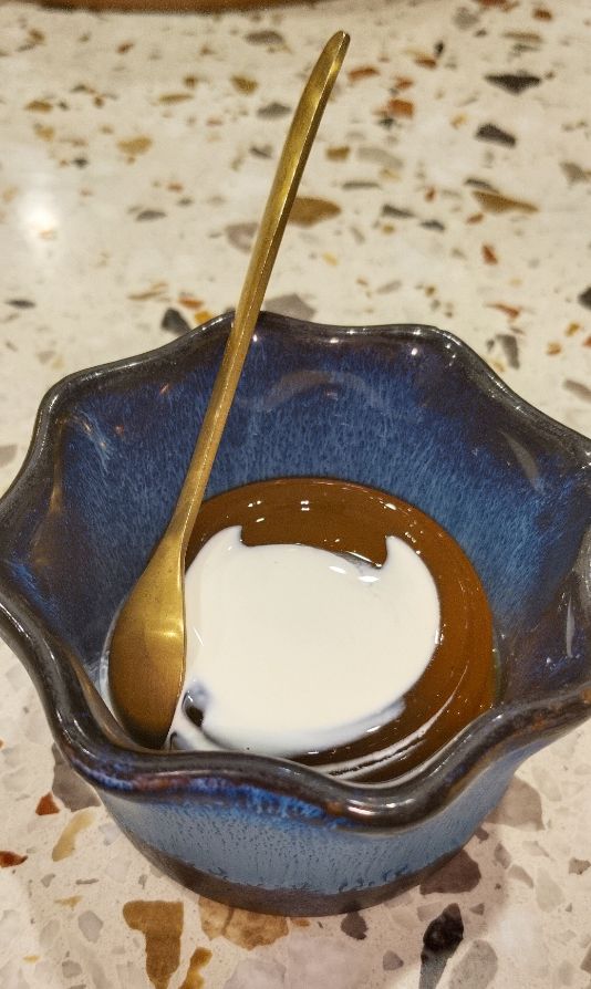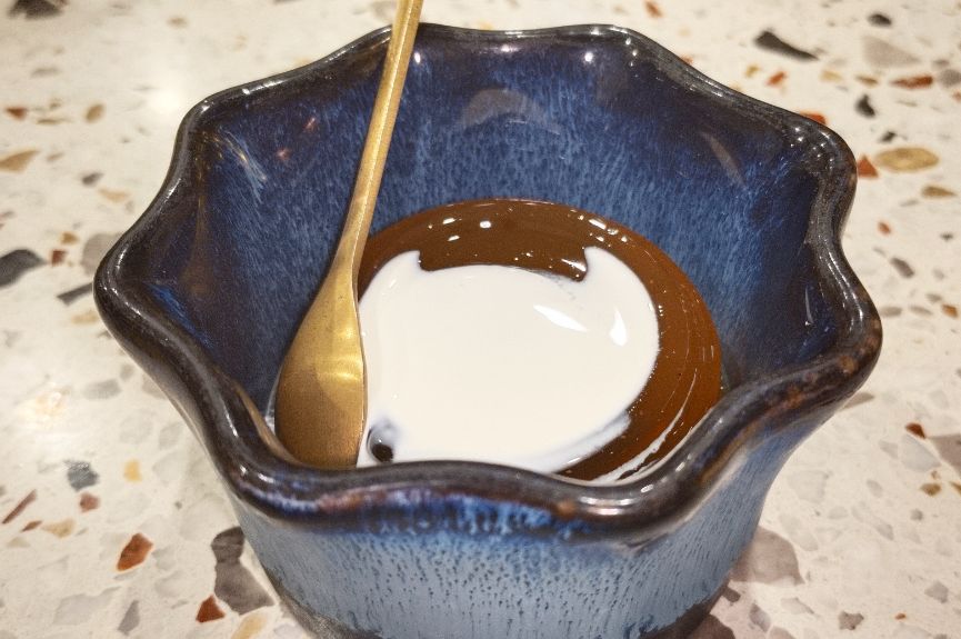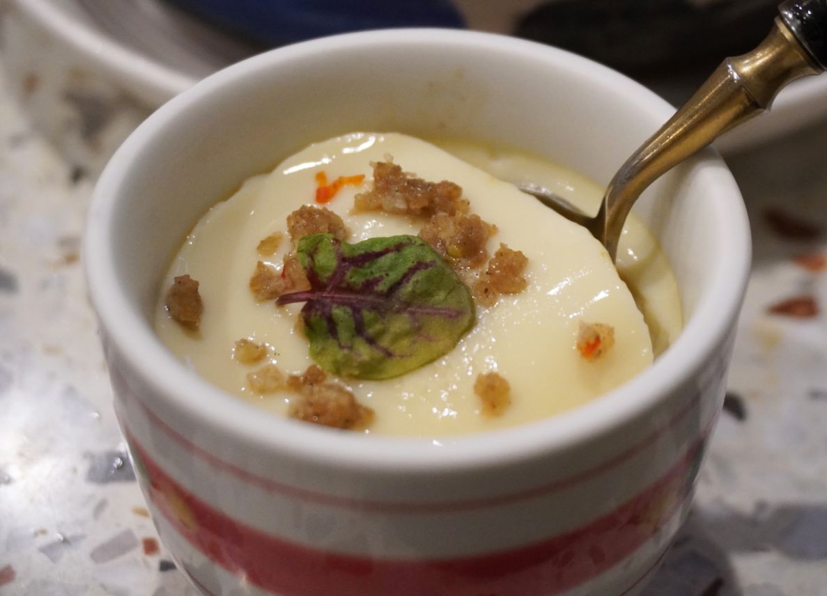 作為套餐料理的結尾,湯明手作茶凍,用的是自家廚房製作的烏龍茶凍,吃起來口感滑嫩,加了鮮奶油點綴其中。