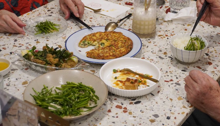 後方用餐區擺上數張4人座長桌,不時會看到饕客單獨享用套餐,也有在地人帶著家人來享用合菜。