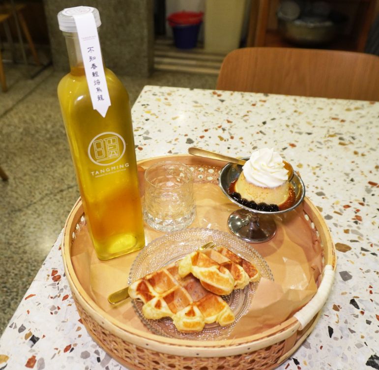 一個木製圓盆,分別裝上玻璃罐裝的台灣茶、鬆餅跟湯明手作布丁。