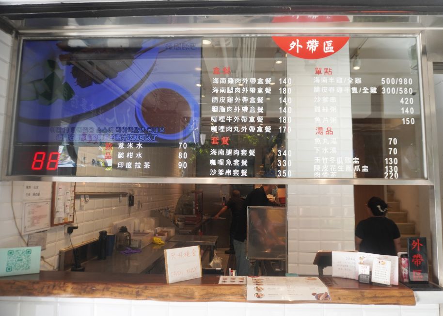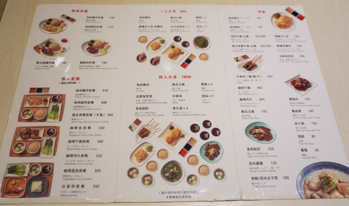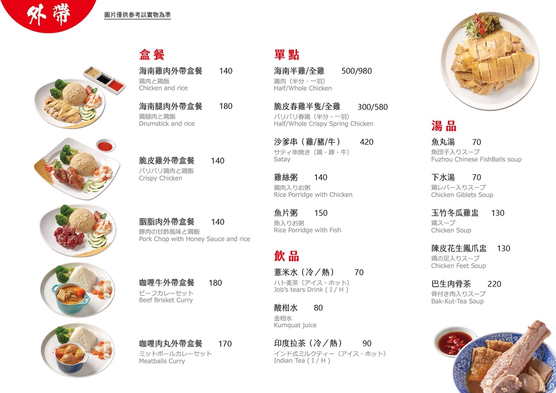 除了主打的海南雞飯,還提供多種快餐、小菜、飲料、套餐及多人合菜。另外也有提供外帶餐盒,價格雖高,但料理實在。